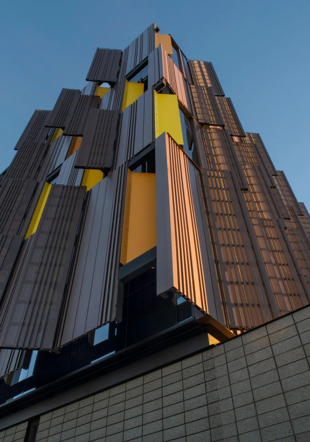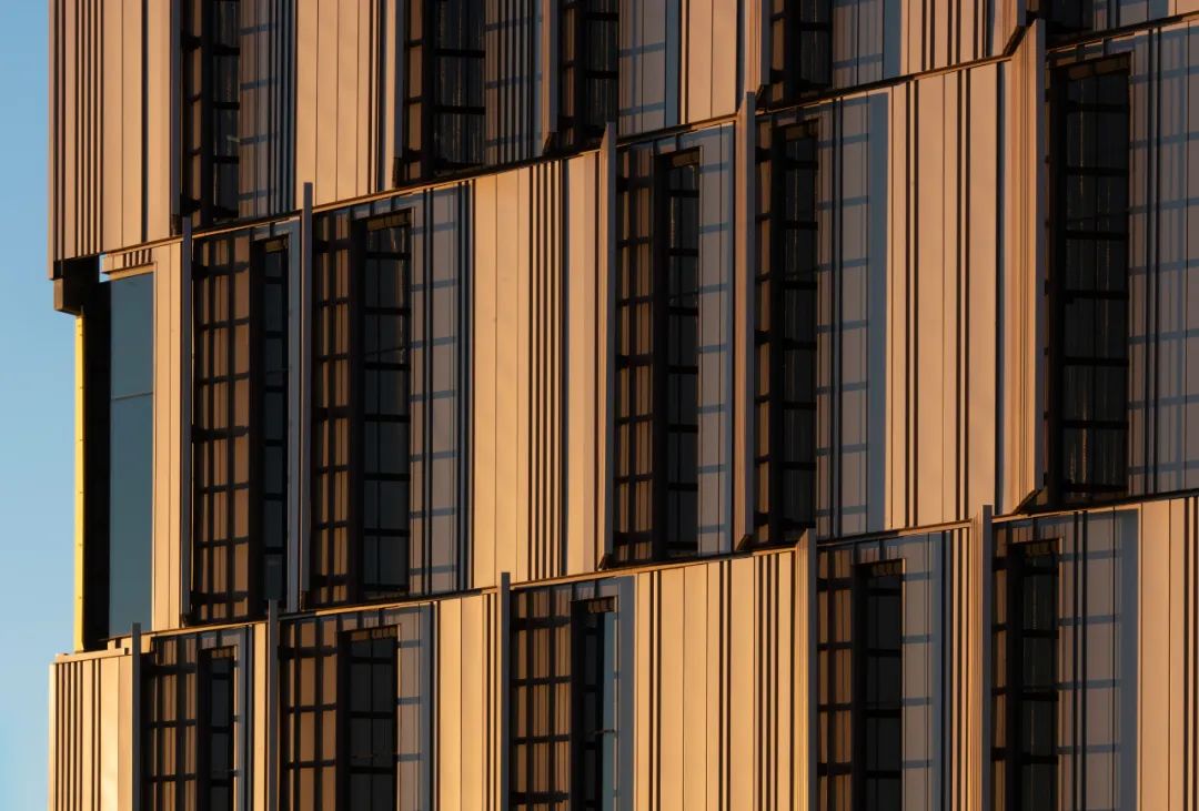 垂直纹理的金属波纹板形成局部阴影并促进空气流动以减少热量的积聚此外,建筑的北立面作为主要的采光面,旨在获取散射的日光。项目采用了具有反射热特性的Solarban