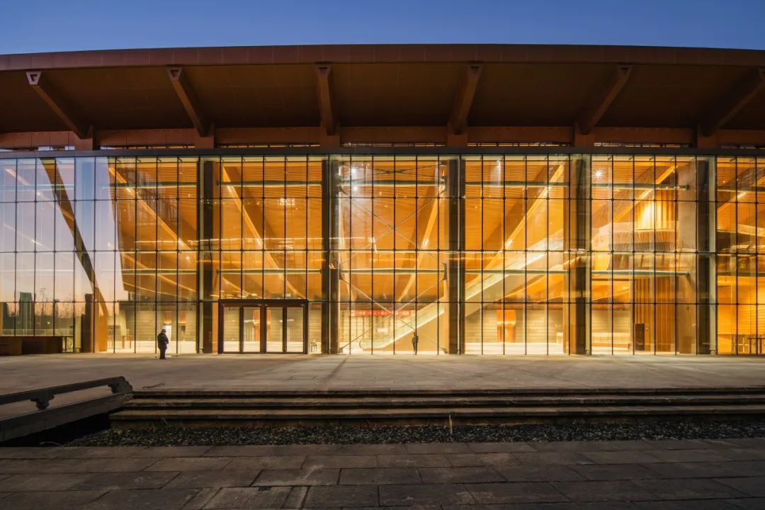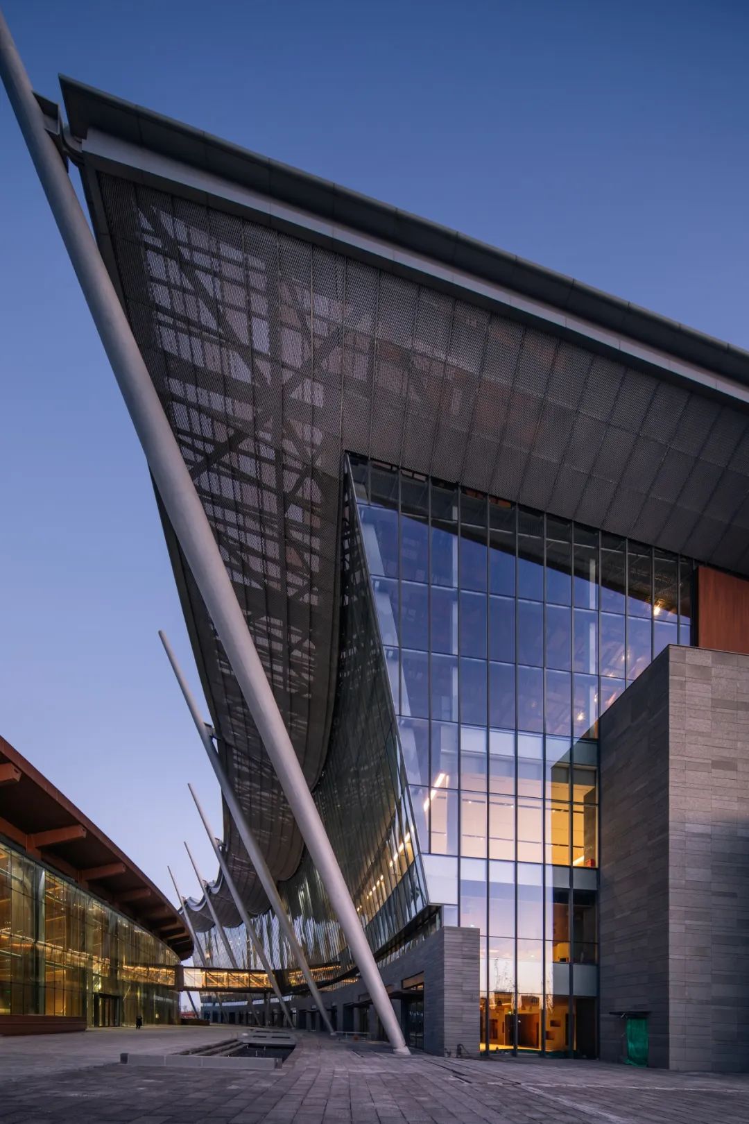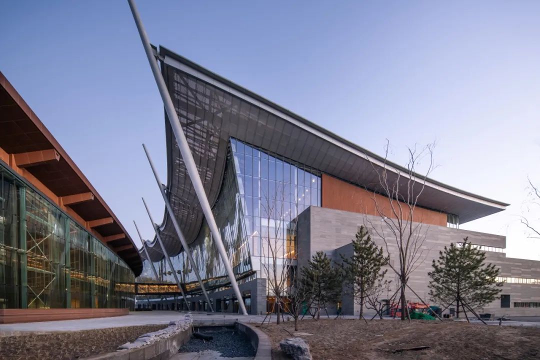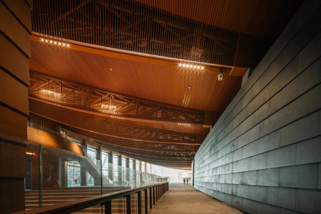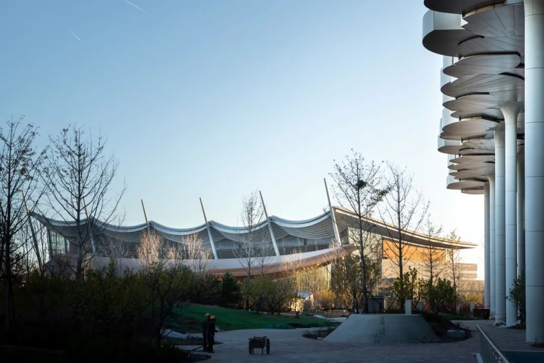 On one hand, the translucent and dynamic white metal mesh material combined with the wooden structure highlights the intention of "ship and sail" in the design. On the other hand, the main building incorporates a deep gray stone material on its exterior walls to represent the concept of "city," symbolizing the compatibility and integration of "Beijing culture" due to the convergence of "Grand Canal culture."