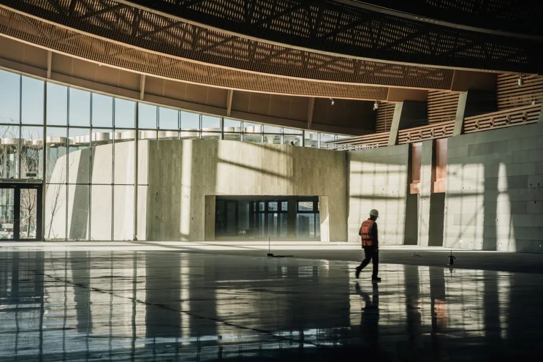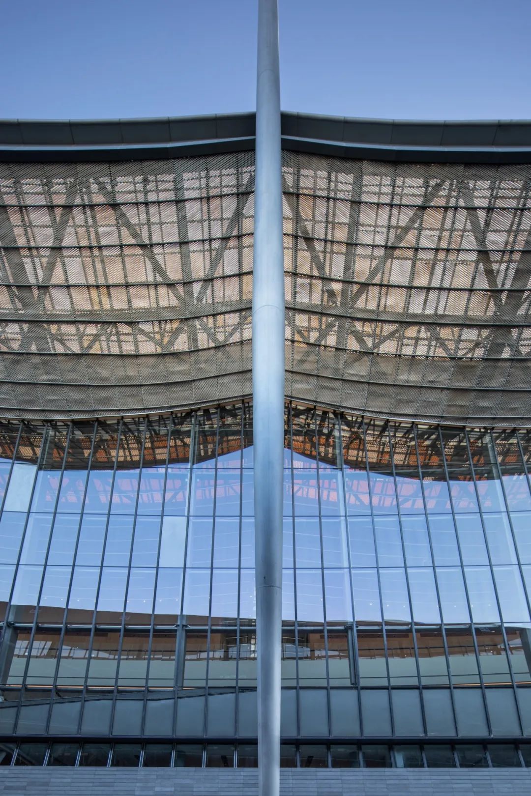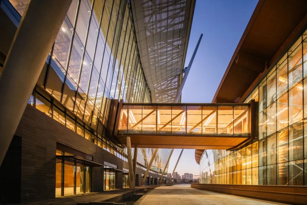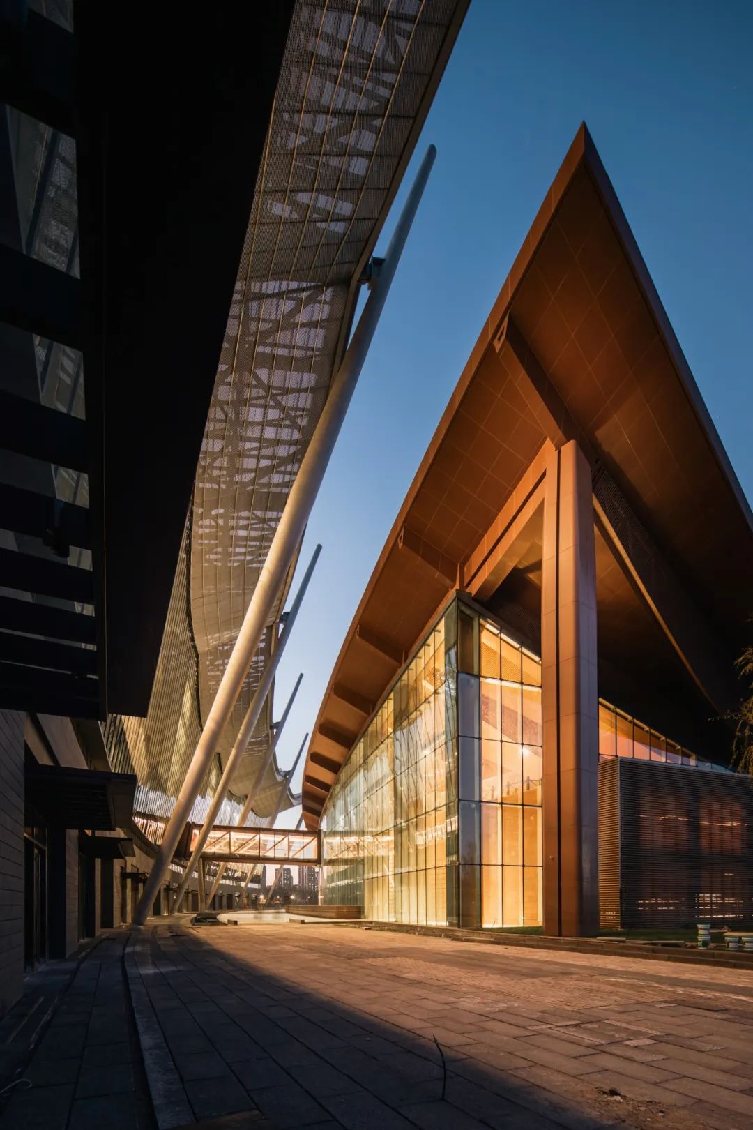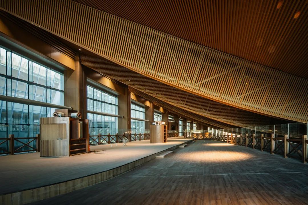 On one hand, the translucent and dynamic white metal mesh material combined with the wooden structure highlights the intention of "ship and sail" in the design. On the other hand, the main building incorporates a deep gray stone material on its exterior walls to represent the concept of "city," symbolizing the compatibility and integration of "Beijing culture" due to the convergence of "Grand Canal culture."