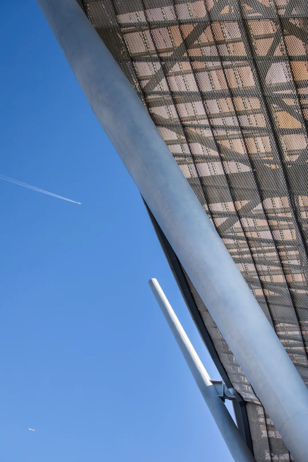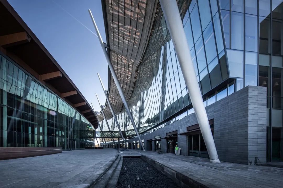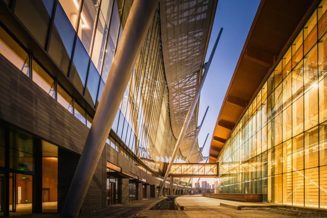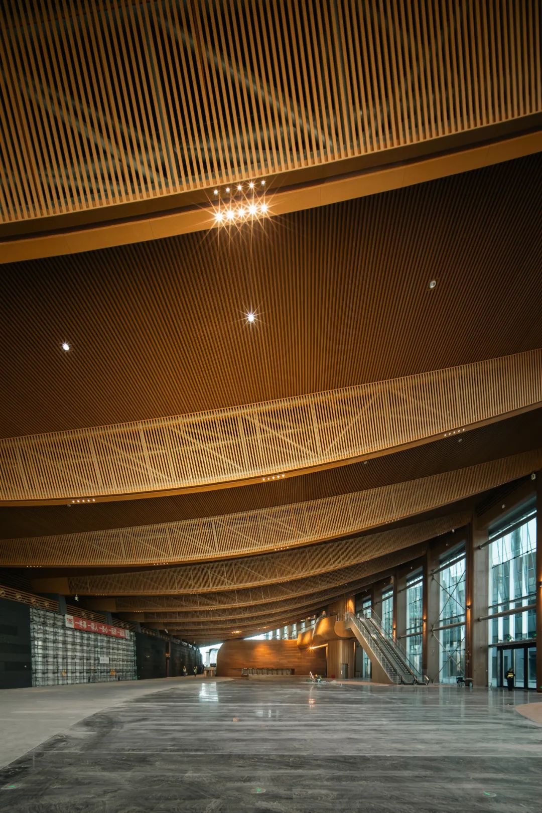 On one hand, the translucent and dynamic white metal mesh material combined with the wooden structure highlights the intention of "ship and sail" in the design. On the other hand, the main building incorporates a deep gray stone material on its exterior walls to represent the concept of "city," symbolizing the compatibility and integration of "Beijing culture" due to the convergence of "Grand Canal culture."