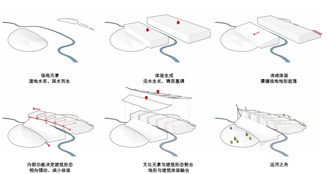 从北京向东望去,大运河畔的城市绿心显得分外醒目,而“运河之舟”也停靠于一片宜人的绿色之中,呈东西向布局,随地势起伏而层层铺开。步行所及范围,涵盖了公交车站、地铁站和共享自行车站,便捷地连接各处,很好地将千年前船运码头所带来的城市繁荣和其承载的极大的交通便利性续到了今天。古运河上一则则关于“船、帆、水”的故事,在这里被娓娓道来,显得沉静而舒展,含蓄且包容。