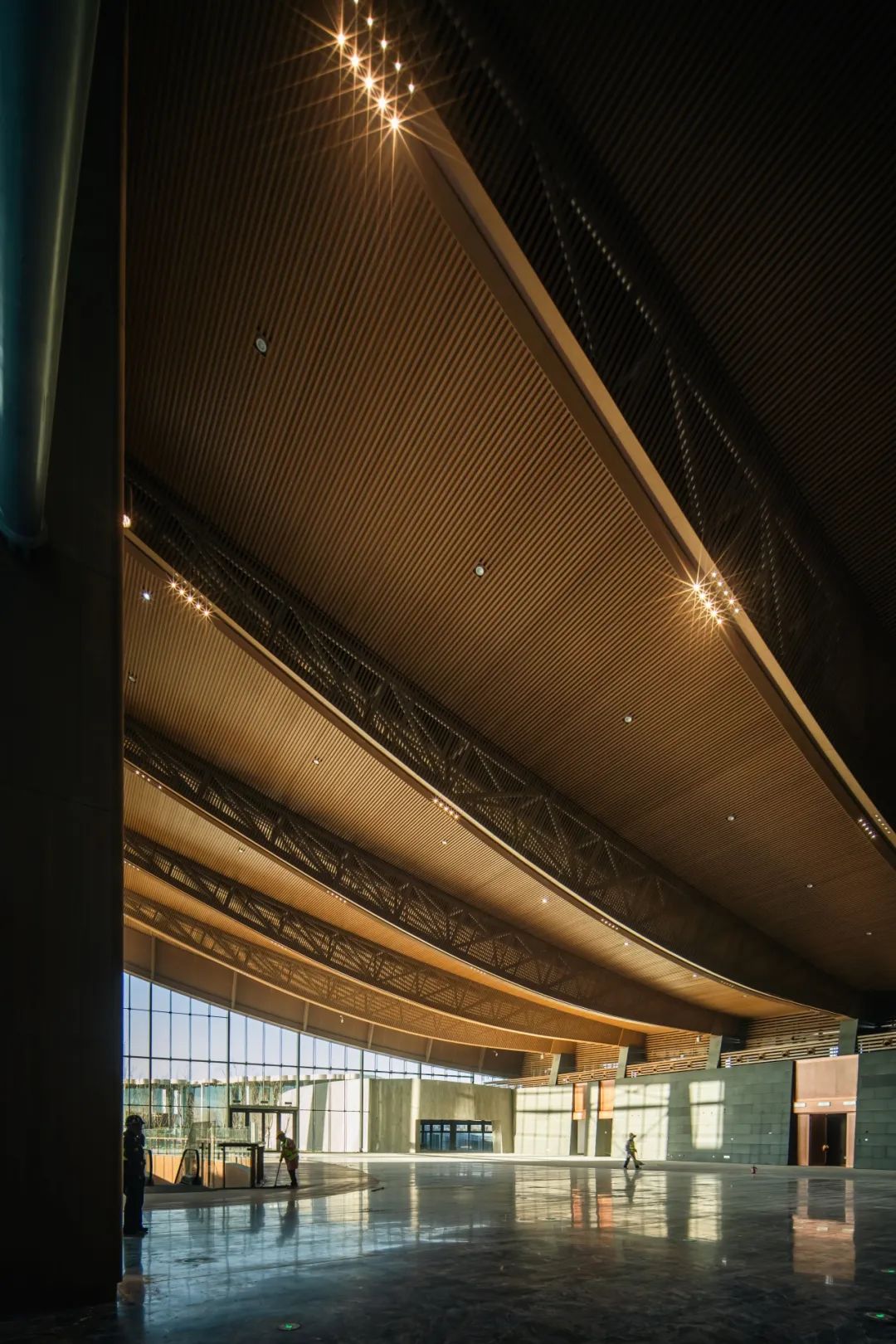 北侧共享大厅犹如巨船,坚实厚重,谦逊质朴,具备礼仪活动、观众参观导览、问询、配套服务设施、展览开幕式、开放式展陈等功能;