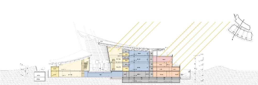 南侧主楼形似巨帆,高高扬起,造型舒展,主要包含展厅、社会教育、文物修复、藏品库房、公众交流、图书阅览以及后勤管理等功能空间。