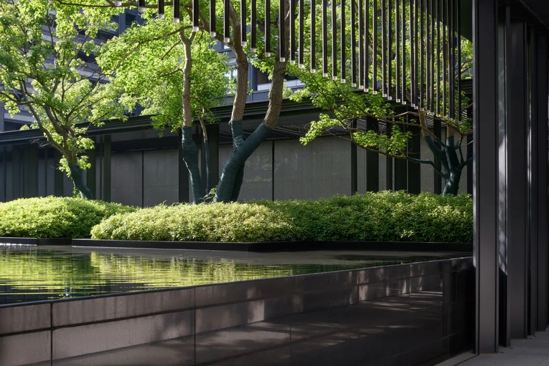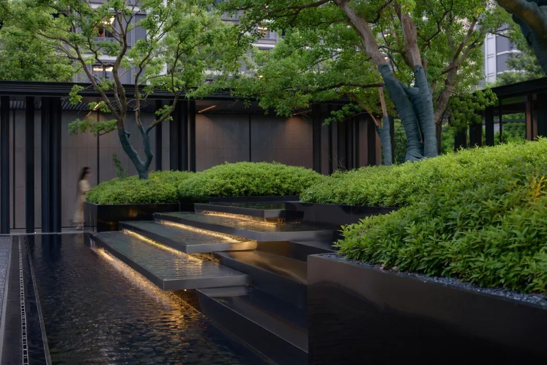 初夏的气息在空气中弥, 细腻的阳光透过乌桕洒落到这一方水院之中,光影斑驳。抬高的叠水一层层如山涧溪流般汩汩而下,树形优美树冠宽大而蓬松的乌桕撑起了整个小院的绿意盎然。我们希望这春夏观景遮荫、秋观叶、冬观形的乌桕,能在不同季节带给人们不同的惊喜。