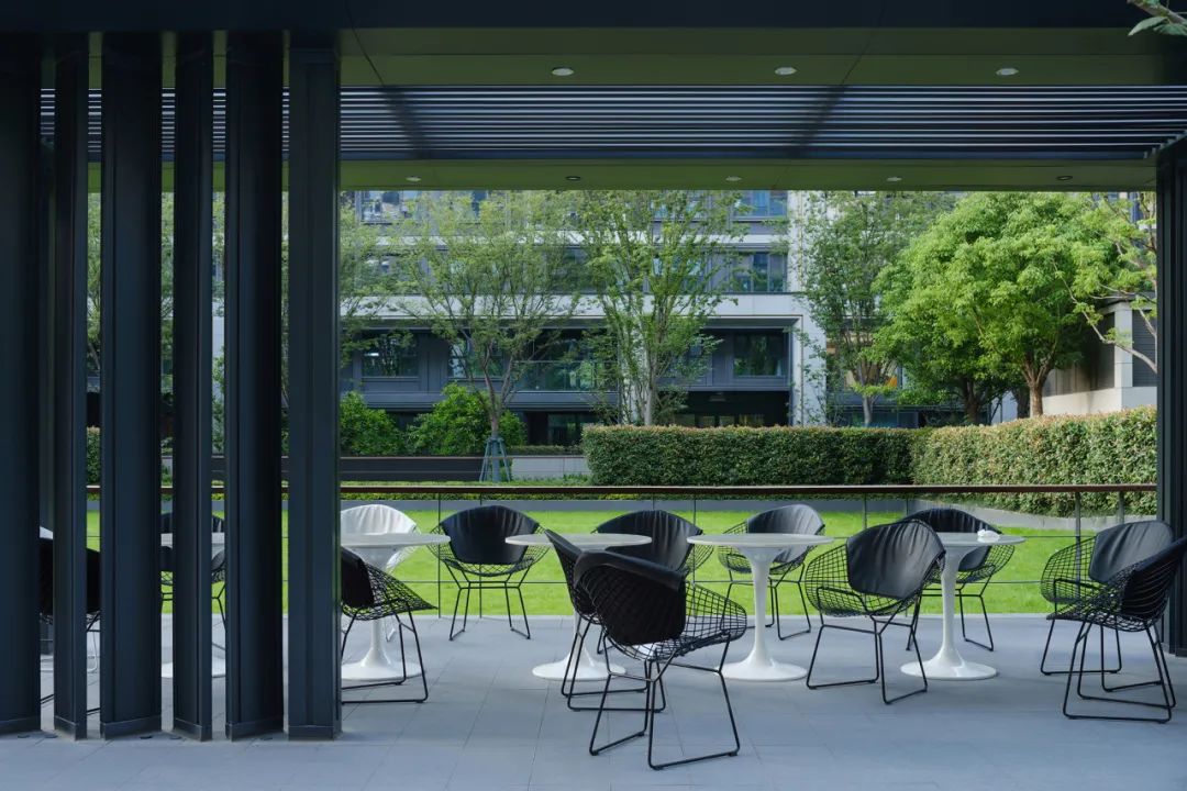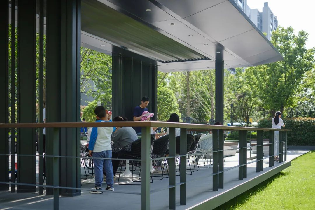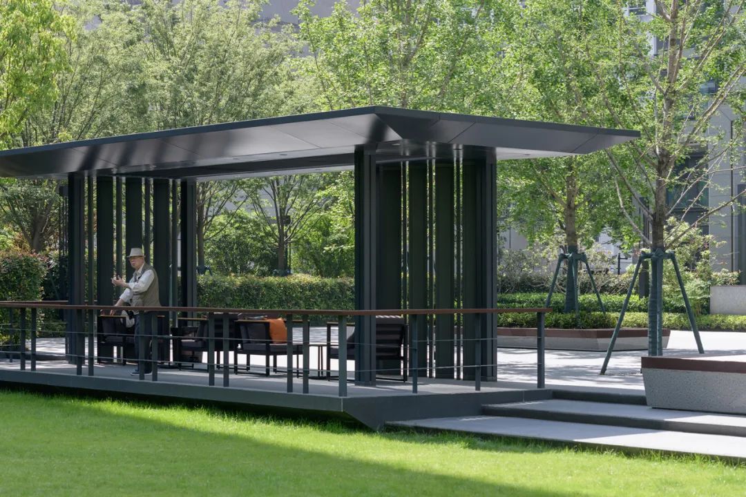 廊架如同漂浮的船只,为人们遮风避雨,为更多形式的活动提供了可能。顶檐角轻盈飘逸,隐藏在林中。在初夏烈日还不那么灼热的时候,这种微反光的状态,会显得格外的温润。