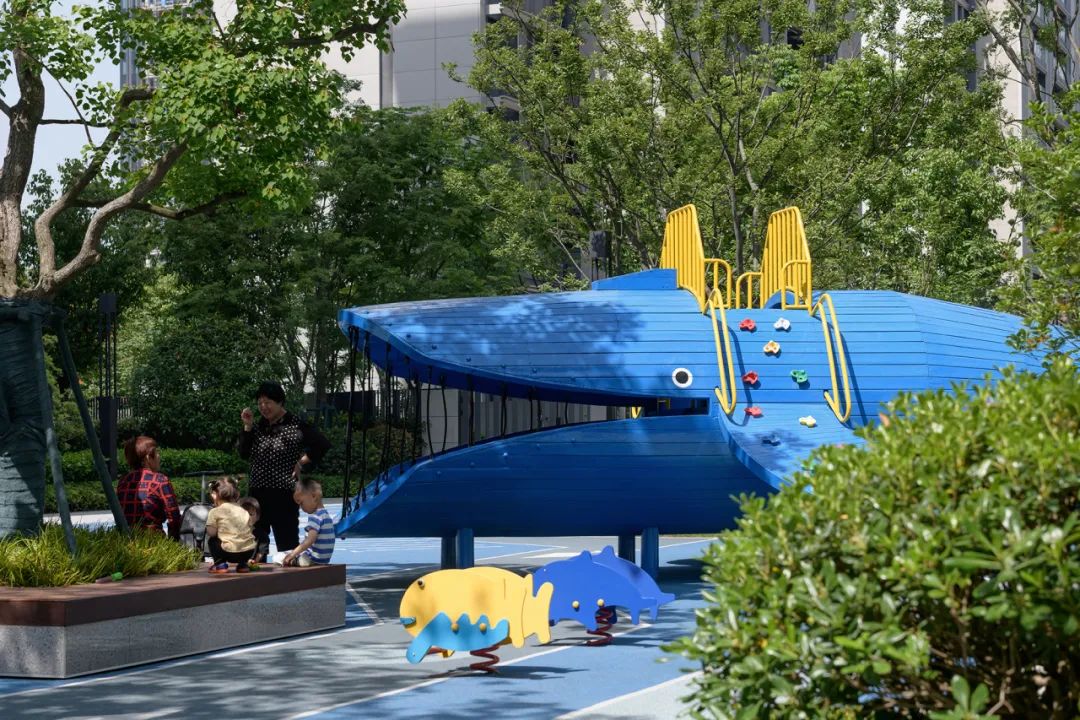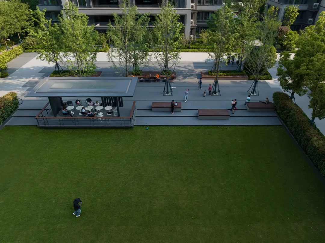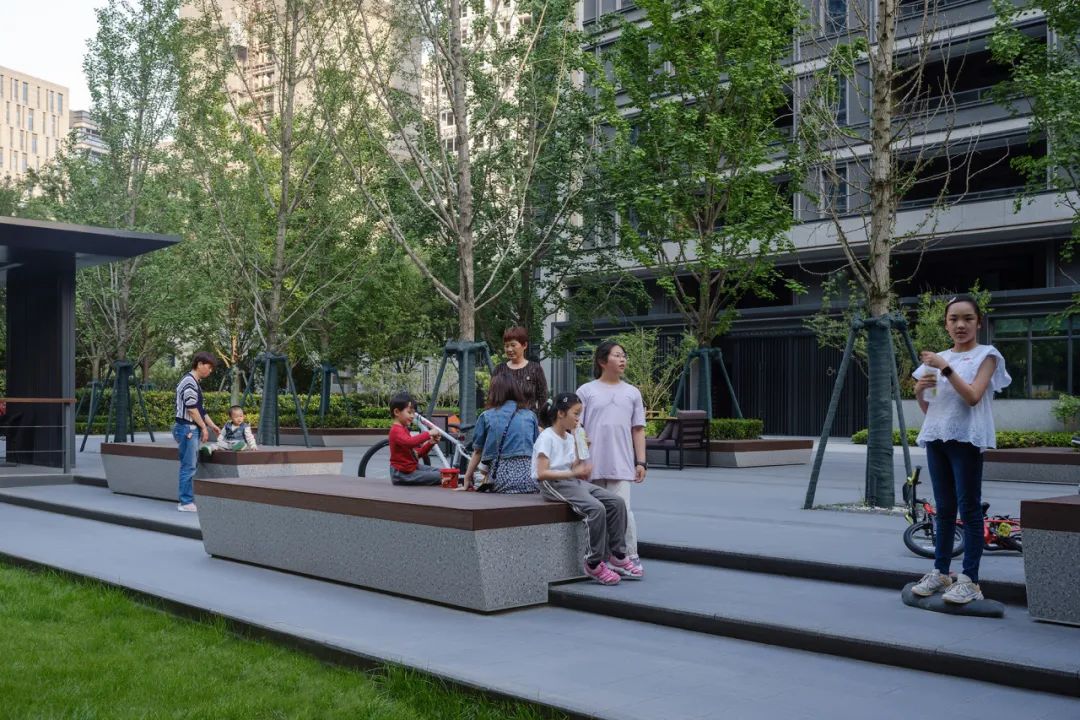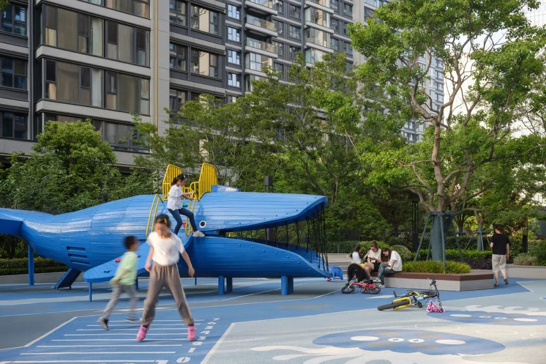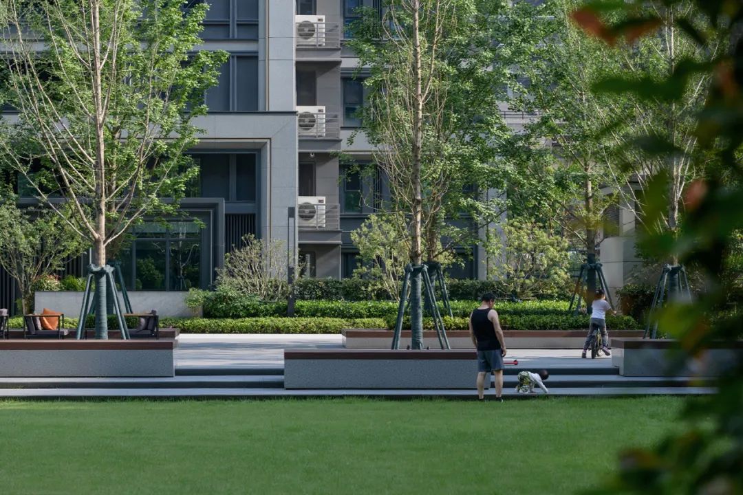 四米宽的归家道,结合扑救面形成林下广场区域,我们巧妙的利用铺装形成水岸与水的关系,中间起伏的大草坪,如浪涌形式形成中间水潭。“软硬兼施”,使孩子们穿梭奔跑变得更加趣味,也让人们的活动变得更加多元化。