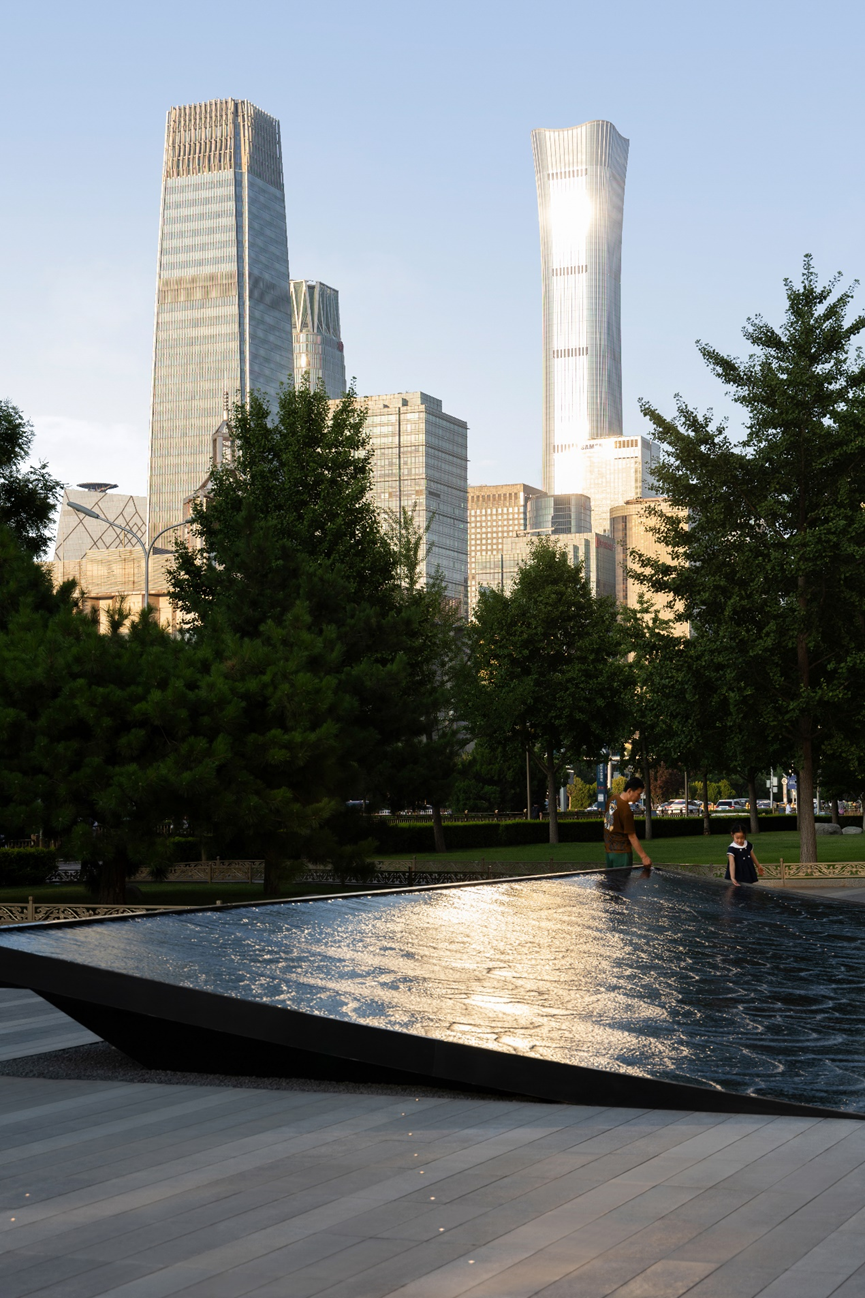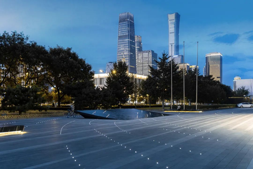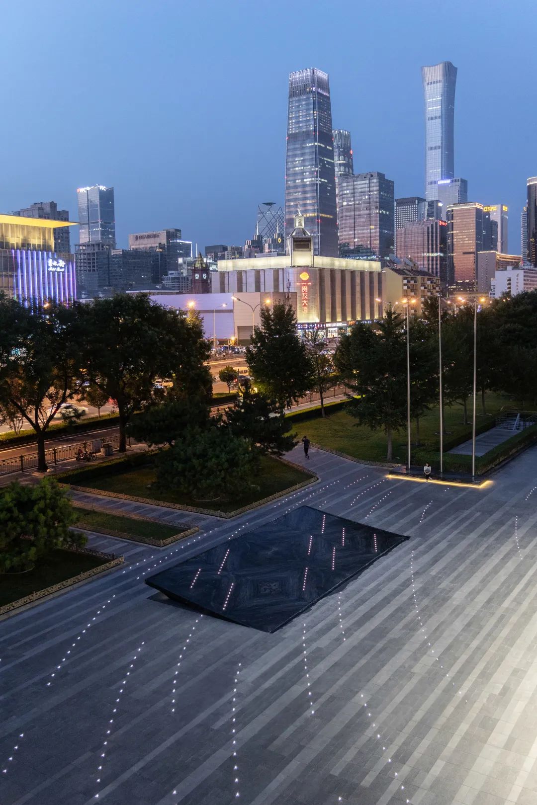 至此,这场流星雨才全部谢幕。从建筑出发的“光”,最终在夜晚以流星雨的方式,洒回这片土地。水景如幕,向上升起,朝向长安街的一面也镶满了点点星光,与建筑入口溢出的暖光交相辉映。