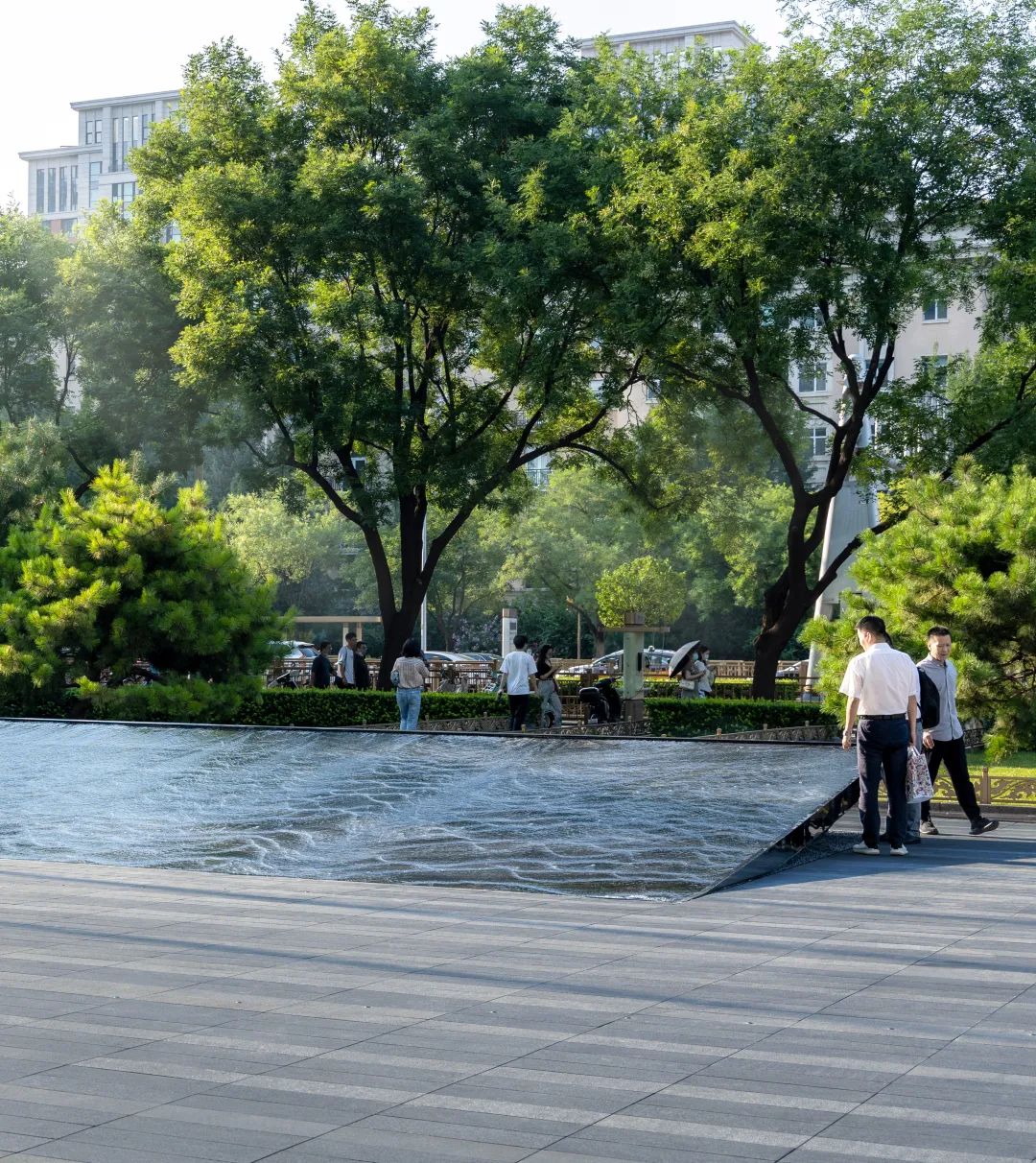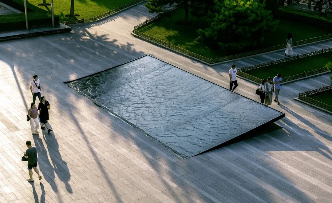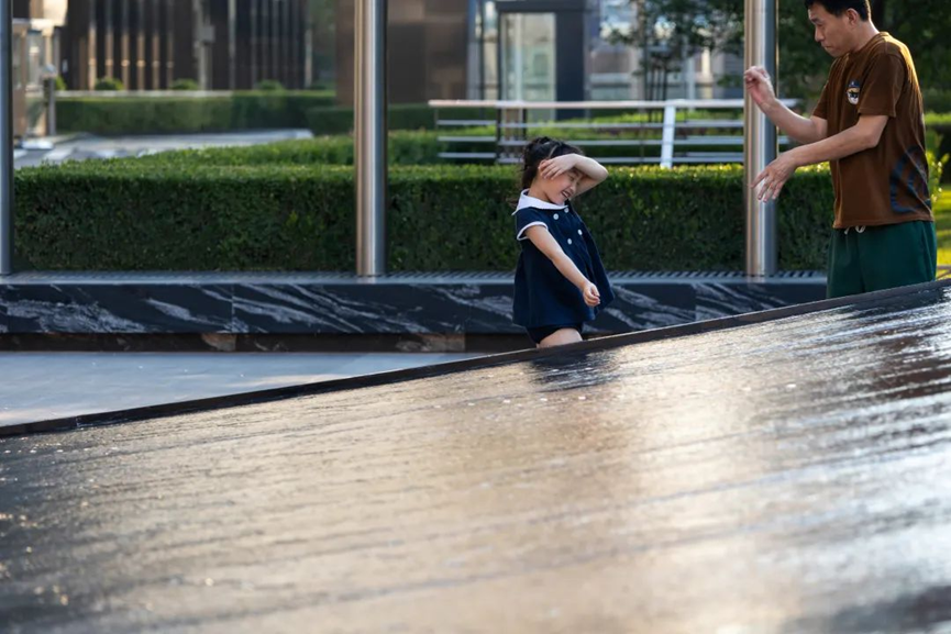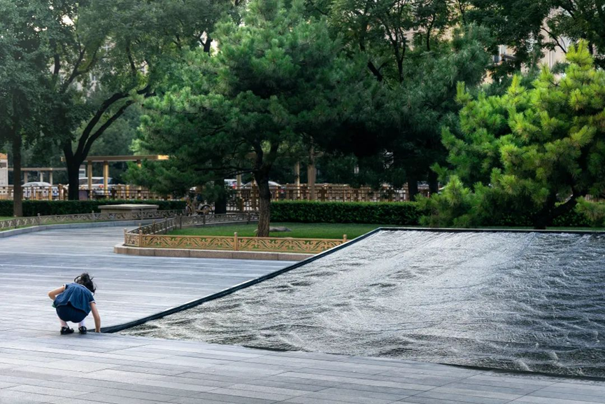 在这里每个人都能找到自己的乐趣。孩子们充满好奇心和喜悦,欢快地在水中戏耍;从写字楼里出来的白领们则在这里歇息,聊天或陶醉在缓缓流淌的水幕中,摆脱繁琐工作的压力;老者静坐于旁,长时间凝视着水幕,似乎在与之对话,享受宁静;路人经过也会驻足触摸水面,拍摄并珍藏这美好瞬间,然后欣喜地继续前行。
