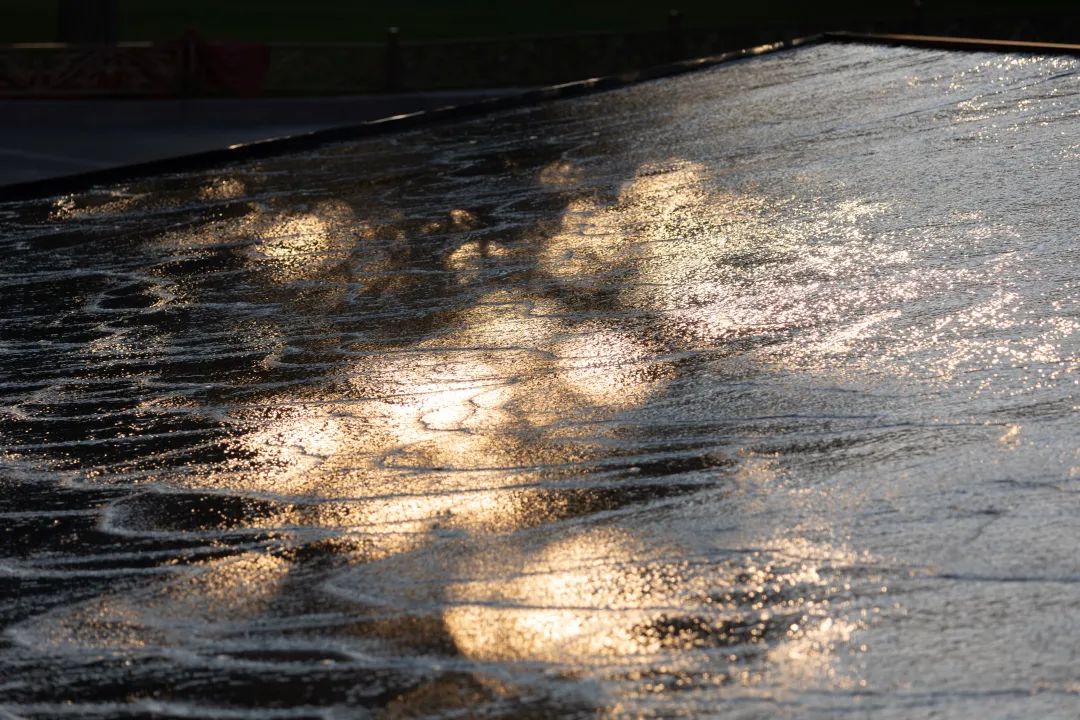 “星空城市会客厅”改造后的中央水景如一幅徐徐向上展开的画布,朝向双子座大厦的主入口展开一场浪漫的双子座流星雨。画布上,一池粼粼波光引人驻足。水流顺着弧形池壁自上而下缓缓流淌,形成一层薄薄的水膜,微风起,吹皱一池水,泛起层层波澜。