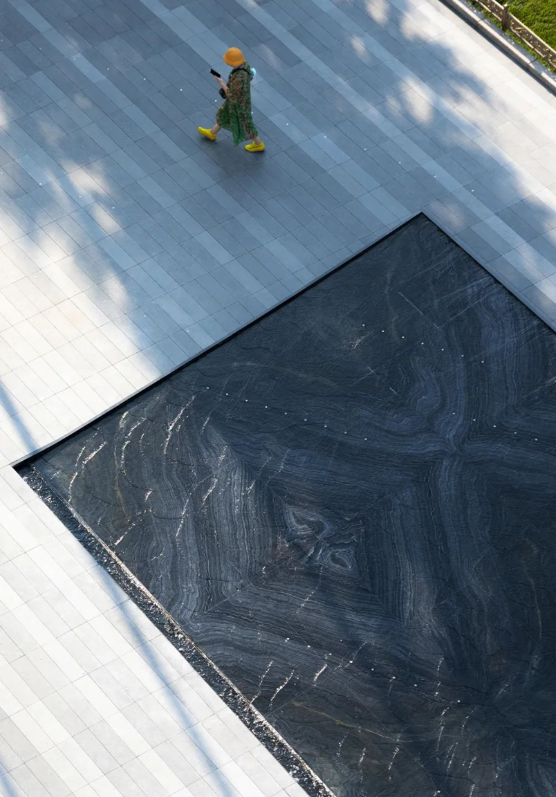从建筑立面寻找对应关系,用深浅的石材肌理变化模拟光影,将光从建筑引向室外地面;同时通过石材整体颜色的变换,界定出人行与休憩的空间;主入口处,则保留现状水景的水电条件,结合双子座流星雨的灵感对水景形式进行升级。