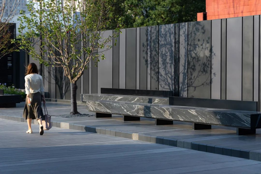 延续铺装的横向肌理,光线从东西两侧抬升而起,形成了一道光影交织的屏风。这道屏风屏蔽了街道上的喧嚣声,为周围的写字楼办公人群和居民们打造了一处难得的休憩空间,让他们能够放松身心社交交流。清晨和日暮时分,阳光将树影投射在屏风上,使这个区域更加悠闲放松拥有一种独特的韵味。