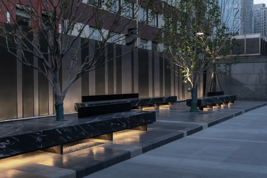 休闲坐凳采用云黑石,黑色的基底上隐现白色云纹,更加强了整个空间的光影感。坐凳结合灯光处理,夜晚如悬浮于空中,轻盈自在。