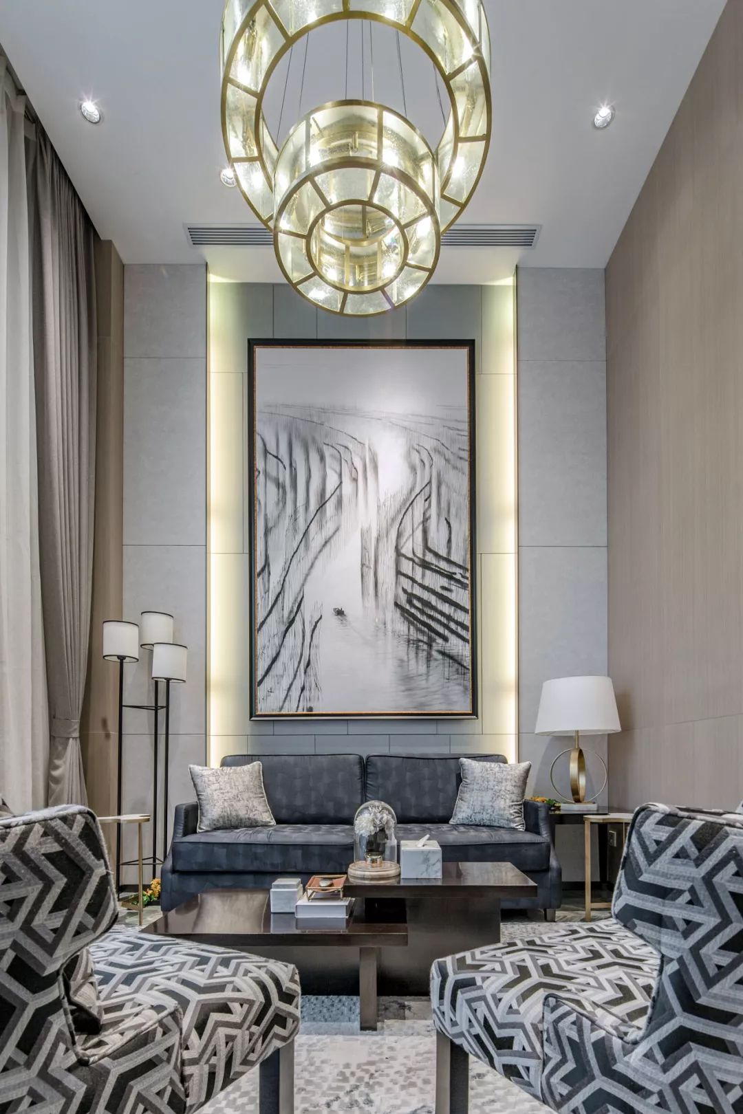 主要材料:太空灰石材 KD板 青铜发丝不锈钢 墙纸硬包