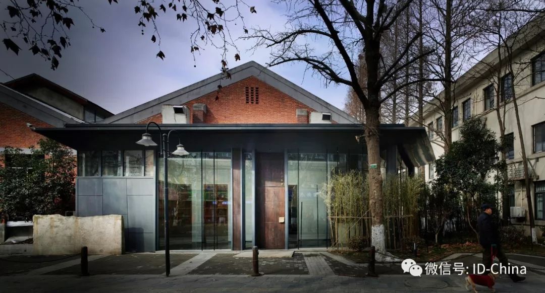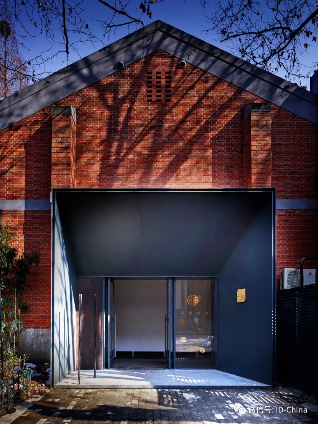 西面次入口则完全不同。内嵌入建筑红砖外墙的3块巨大黑色切面,将入口聚焦到中心,营造出现代工业感的同时,与精细的黄铜制logo在视觉上形成反差。