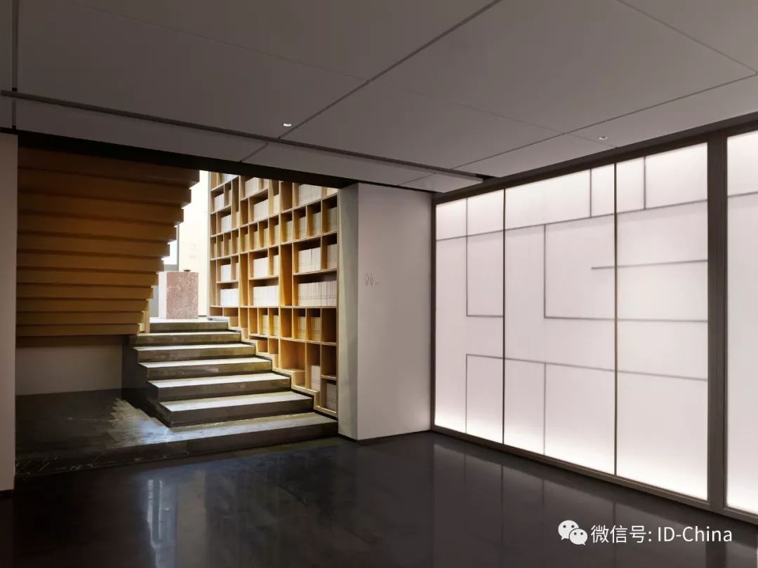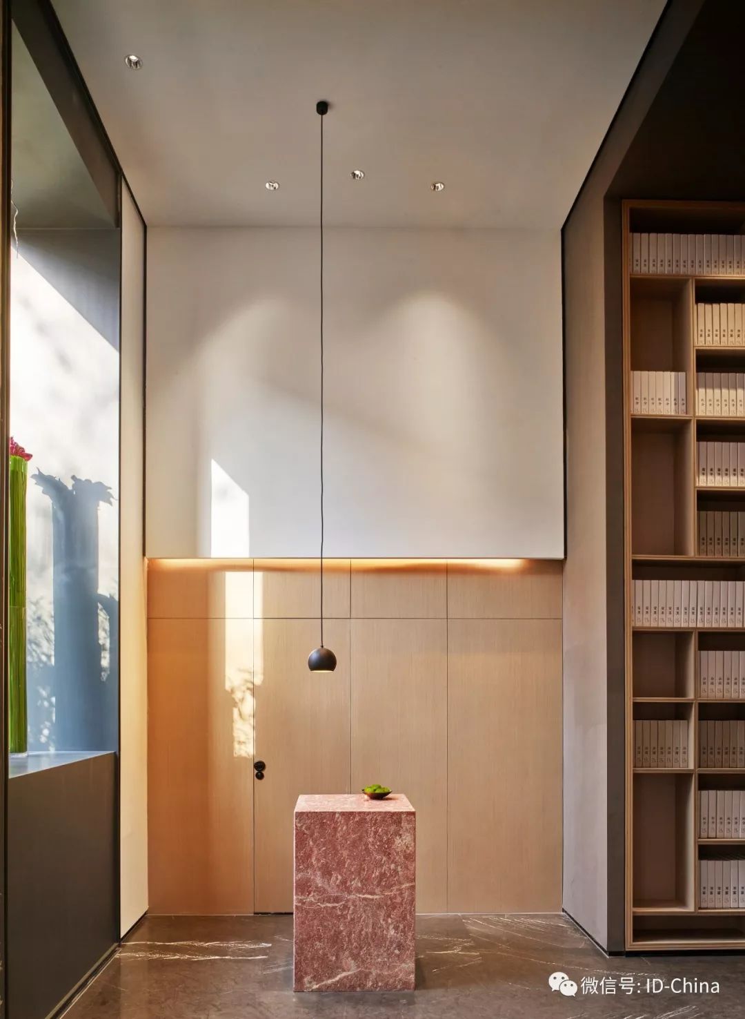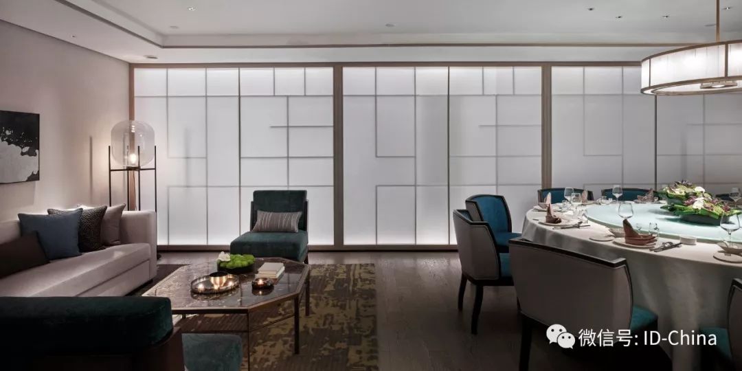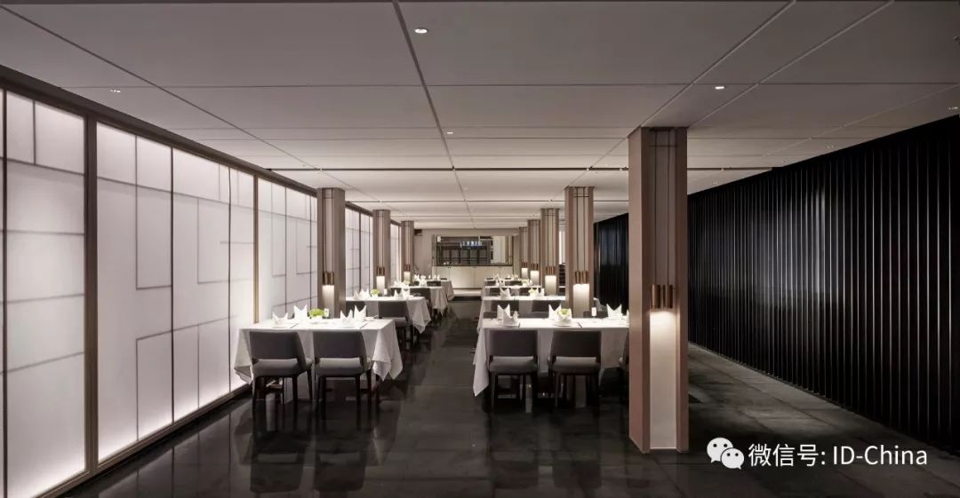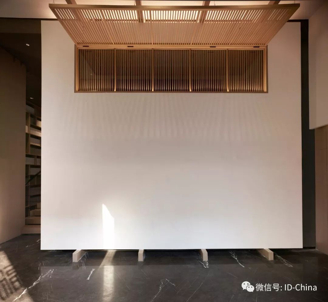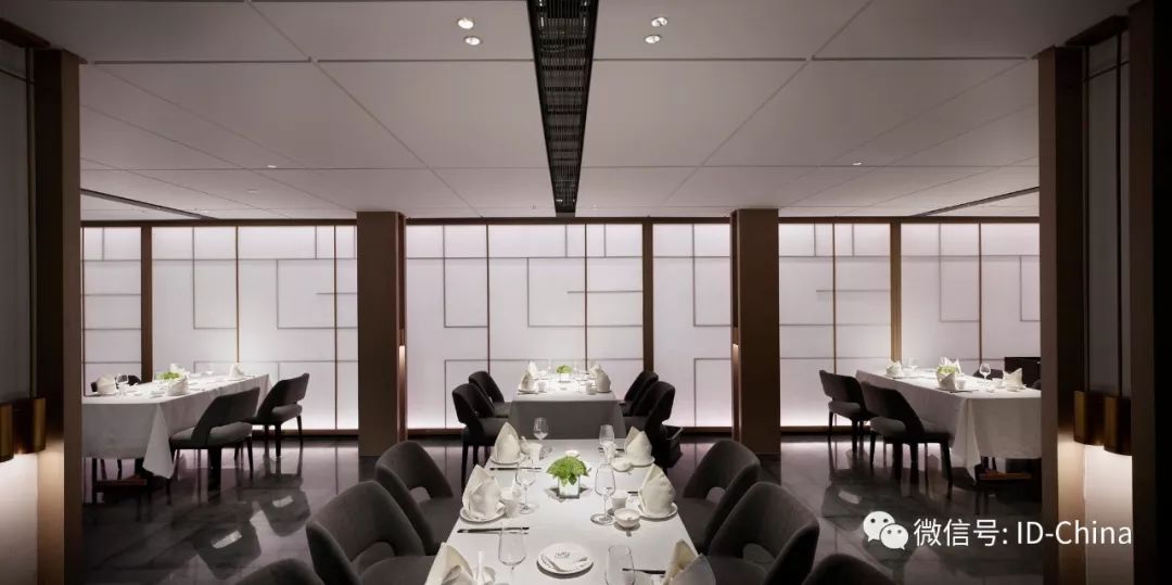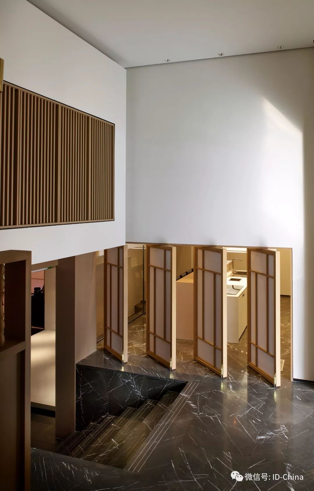 公共餐区的另一侧,设计师采用了宣纸裱糊的屏风墙将杂乱的采光和斑驳的墙面阻挡在就餐空间以外。宣纸略微毛糙的表面柔和了光与影,如同一层面纱带出了场所儒雅的气质。