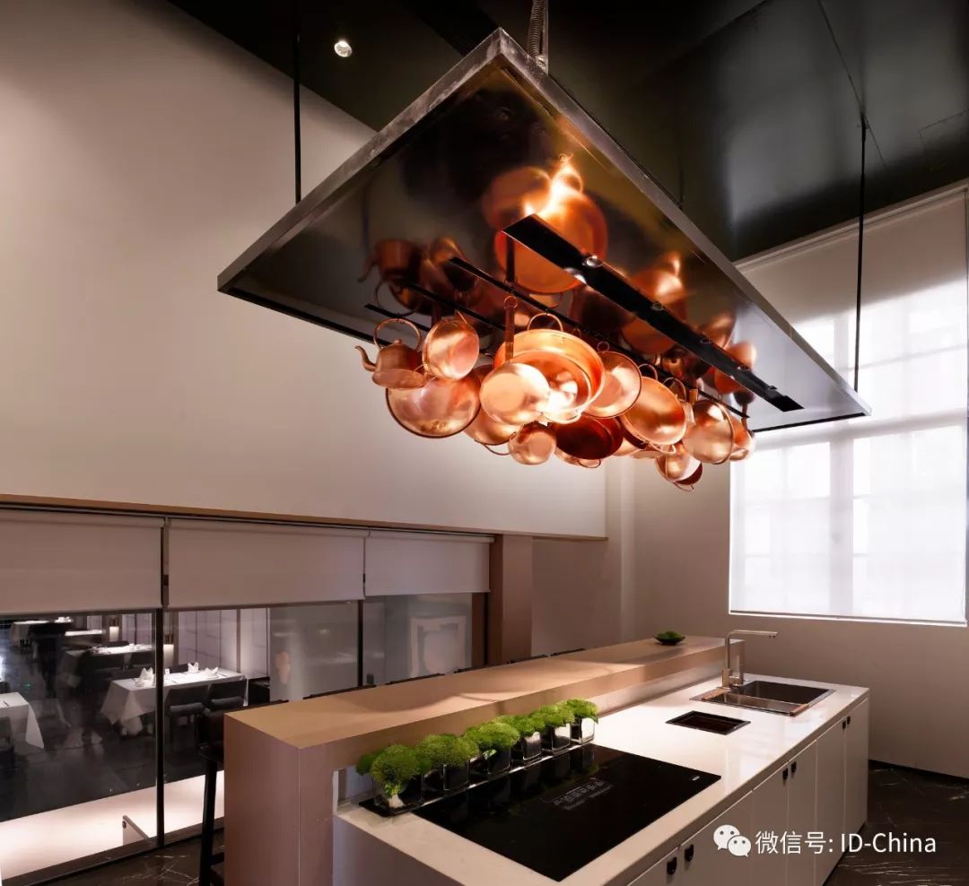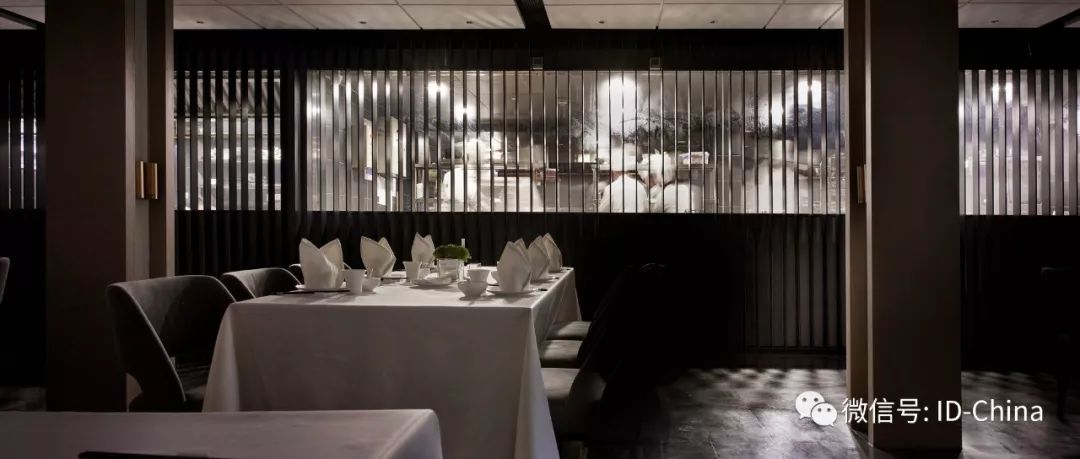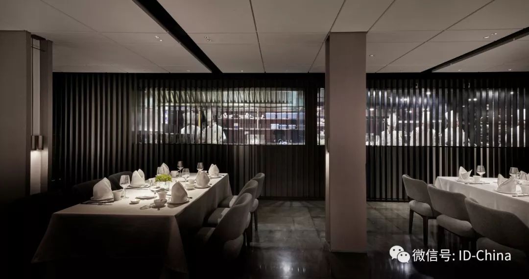 从主入口步入餐厅,经由前厅进入一层空间。在这个下沉式的空间内公共餐区和半开敞的厨房平行而居。设计师希望此时此刻,食客与厨房之间是一种相对独立而又相互关联的关系,大约可以通俗地被理解为视觉上“藕断丝连”。设计师采用黑色的条形钢板纵向排布,在厨房的玻璃立面上形成格栅。这样,在人行进的过程中,前进方向的格栅完全遮挡视线,而只有当停驻并正对格栅的时候才可以看到厨房内热火朝天的景象。