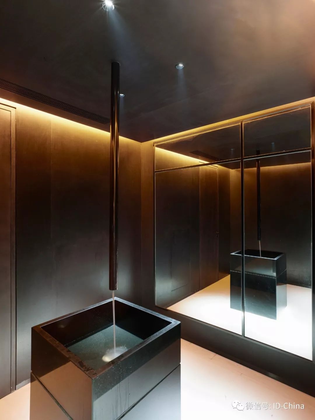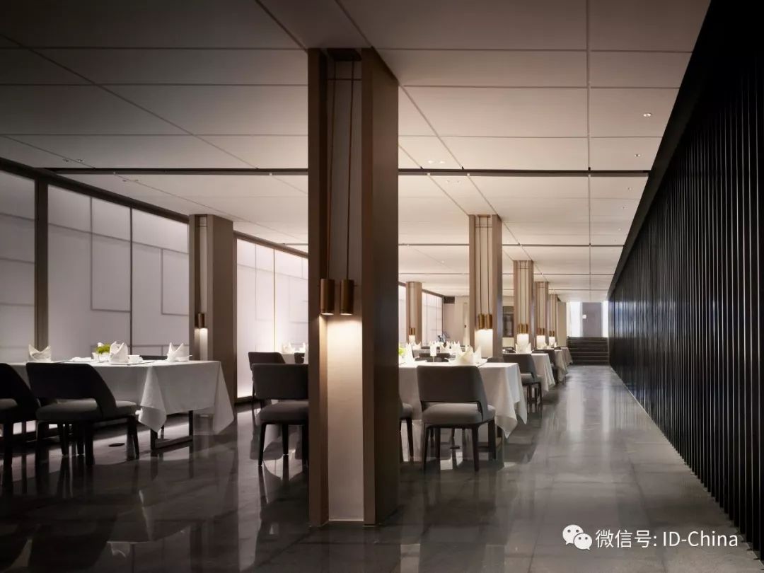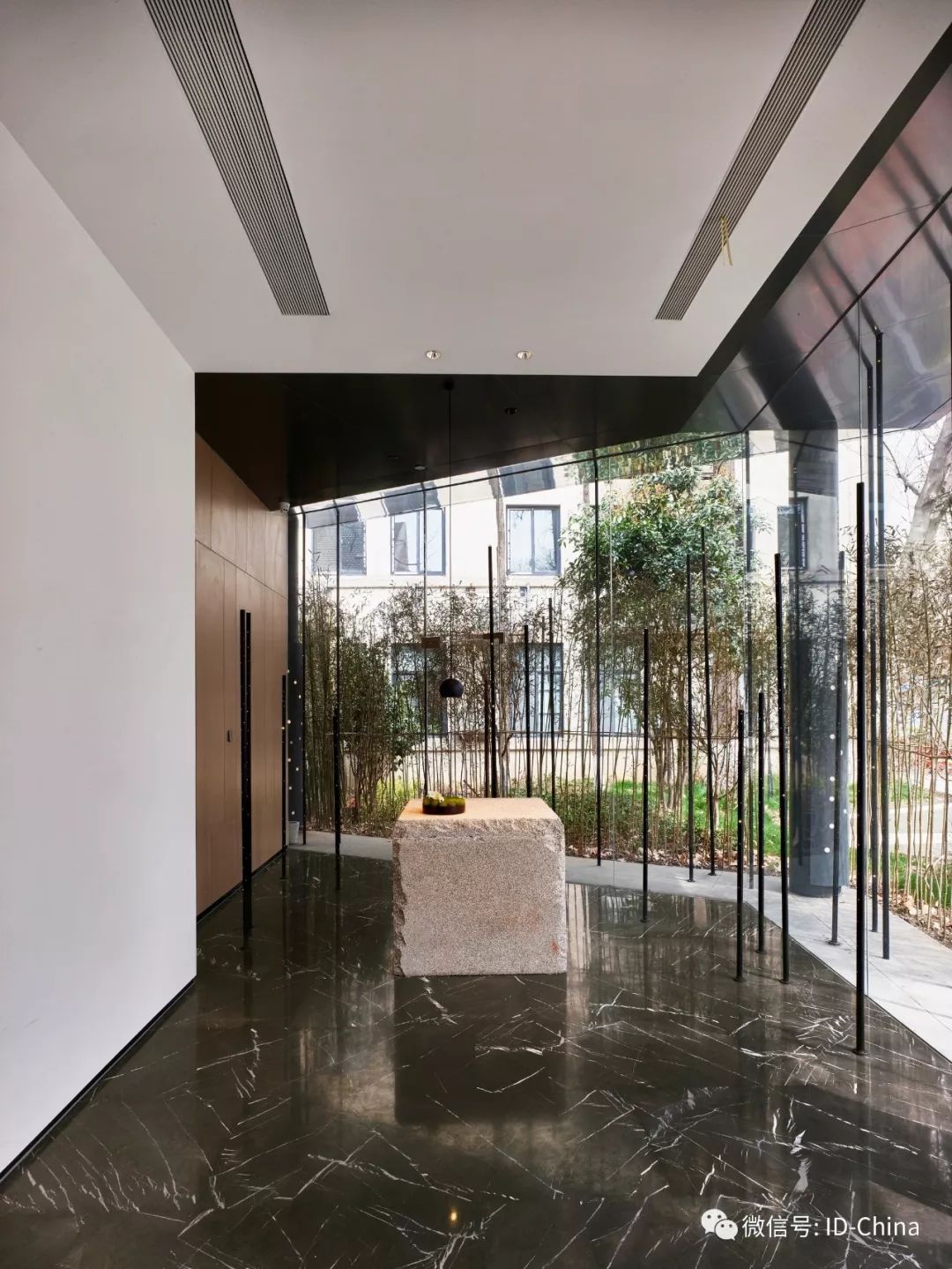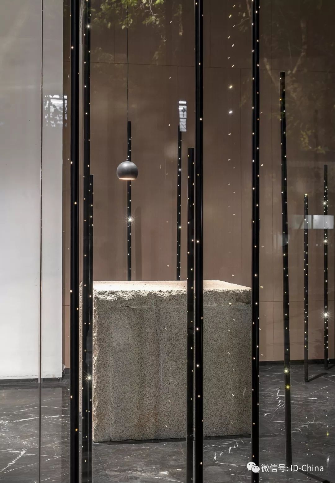 为了将入口处的“竹林”概念从室外引入室内,设计师在门外以及前后厅处树立了许多高外不一的黑色穿孔金属管,并将灯源置于管内,以模拟出竹子的形态。当夜幕降临,灯光从金属管的孔洞中渗出,就仿佛夏夜竹林里的萤火虫在闪烁,模糊了城市乡野的界限,也带出了对自然的向往。