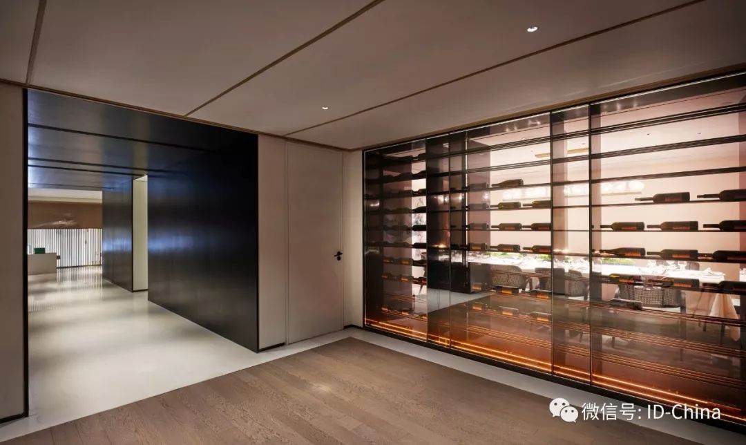 设计师采用大面积落地玻璃打造立面,高窄而厚重的木门右上角悬挂着并不起眼的餐厅名字。在这里,木门与玻璃立面的位置关系颇为讲究,设计师将木门位置设置在正对一层餐厅的入口处,这样一方面从街边路过的人们虽然可以透过玻璃看到前厅的别致装饰,却看不到公共餐区内部;另一方面,在引入自然光线的同时,也为餐厅保持了一定的私密性,引人一探究竟。