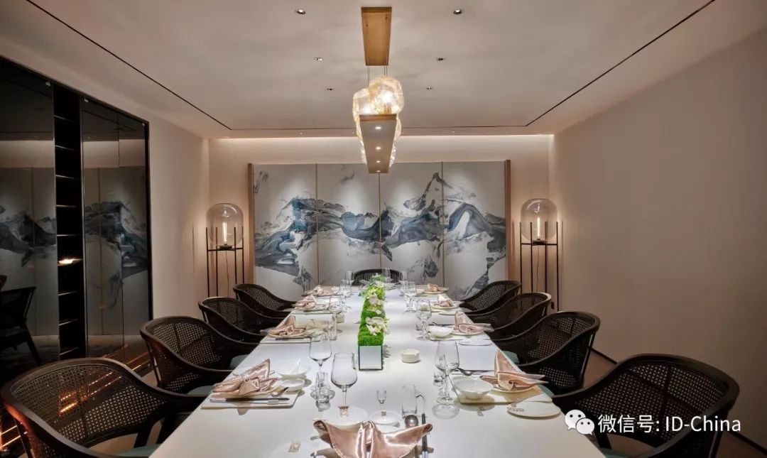 餐厅整体色调素雅。墙面、天花主要以白色涂料和浅色木板包覆,公共区域地面采用冷冽的深色石材铺设,而包间则选择了相对温暖的实木地板,在视觉和知觉上将功能区域自然分隔。