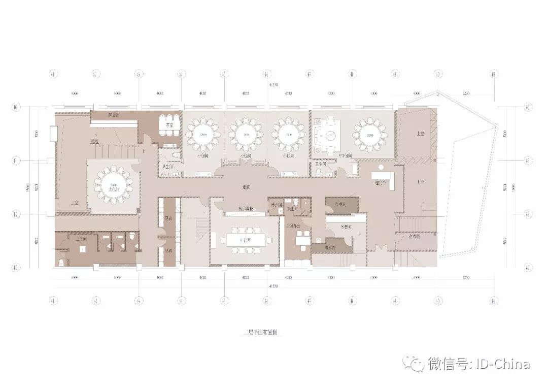 设计师将层高10 m左右的单层建筑空间分割成3个部分,首层向地下借了部分层高,形成公共餐区和半开敞式厨房。二层为包厢,过道的南北两侧排布了大小不等的6个包间和1个茶室兼图书室,均以节气命名。三层则主要由办公区域和几个独立包间组成。