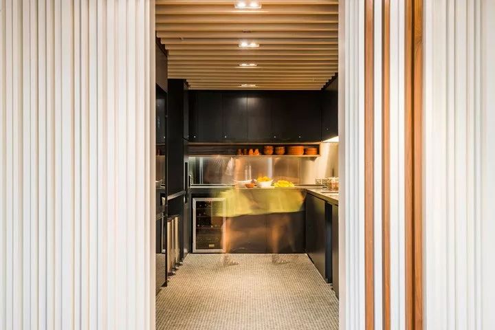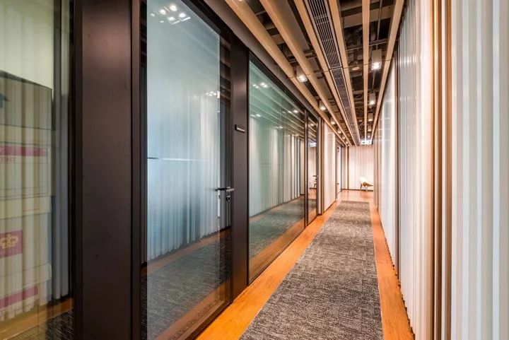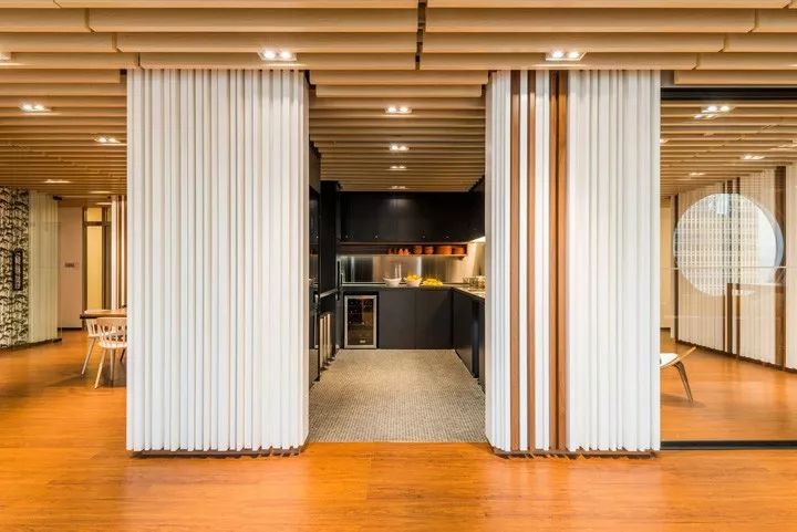 不同的行业属性对开放性的空间需求也不尽相同。对于本案,设计团队专门开发了一个移动门解决方案,根据需求谨慎开放空间,当移门关闭时又是非常好的隔音装置。这种因需求而设计的移门装置成为本案的特色装饰元素,同时增强了每个房间的隔音性能。