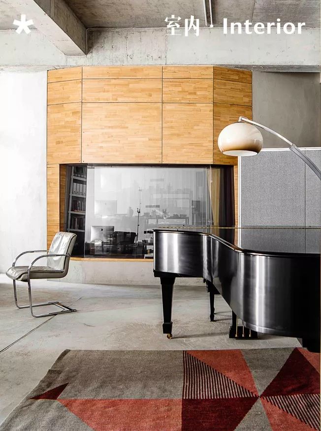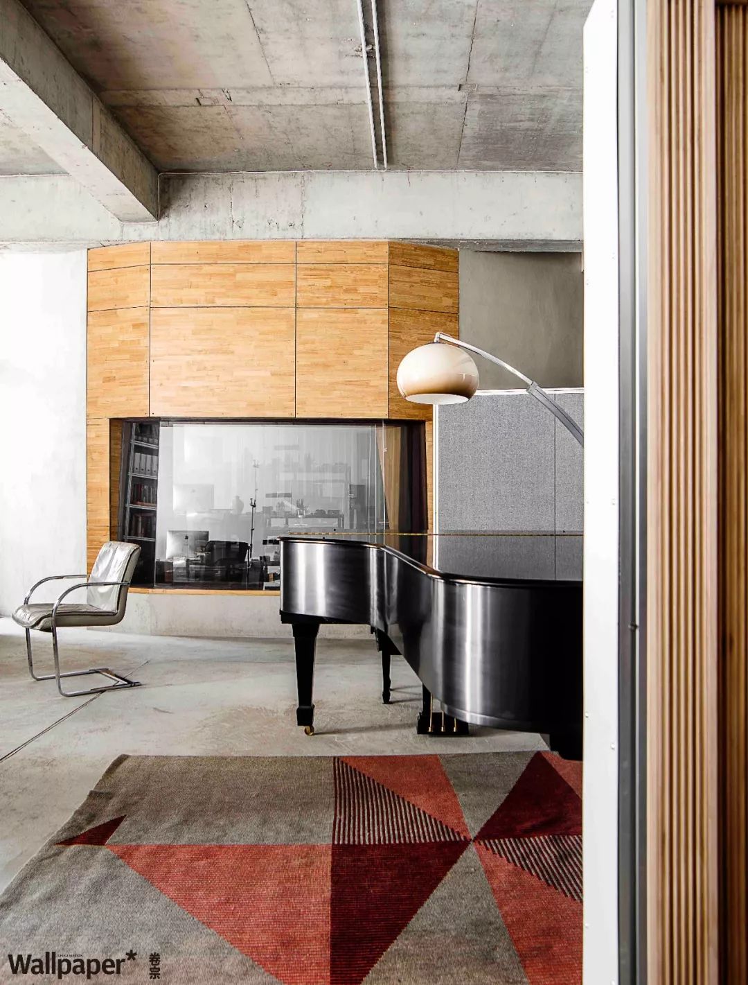 上 琴房里的木质控制室穿插在灰色之中,为室内增添了暖度,左侧为 Wim Rietveld 设计的悬臂椅,右侧施坦威钢琴占据了近四分之一的空间,红灰相间的几何图案地毯丰富了空间视觉