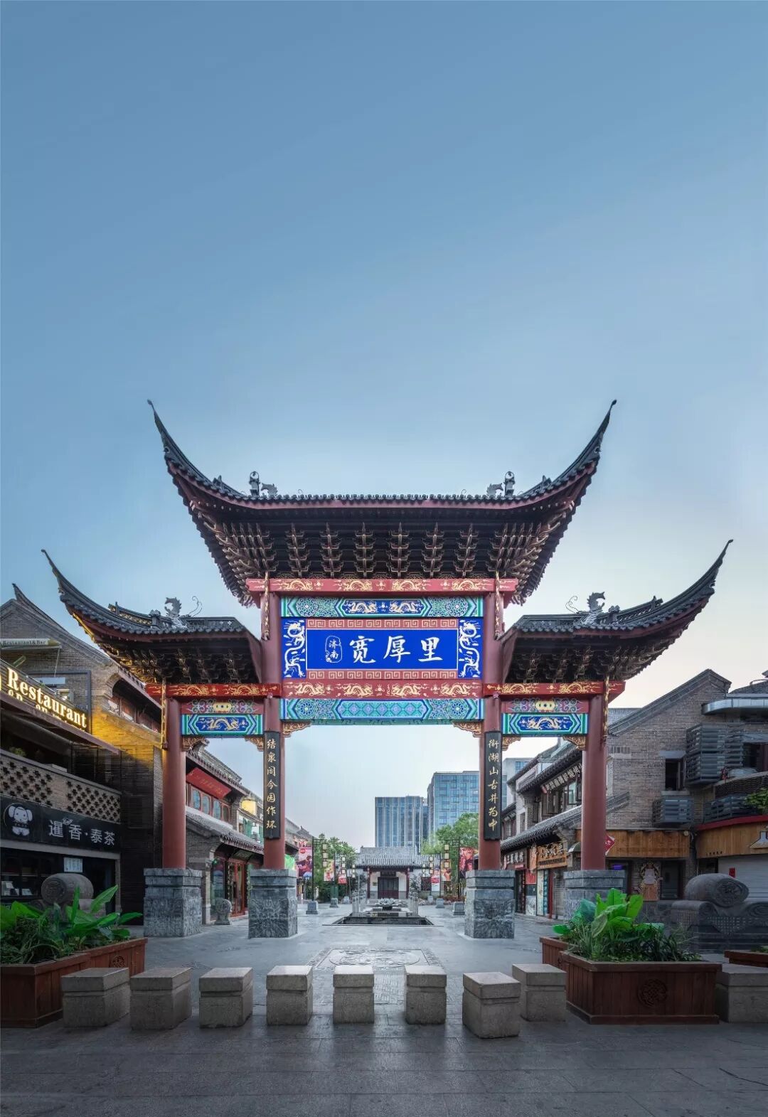 入口处的牌坊昭示着本案的名称来源于原有地名“宽厚所街”,独具地方文化特色的建筑布局,延续了老街的空间尺度和材料质感,院落肌理清晰。大量使用了瓦灯等隐藏光源,搭配暖色光照明的设计,使得宽厚里的夜景具有很强的传统建筑韵味及辨识度,体现传统建筑特色的灯光展示。