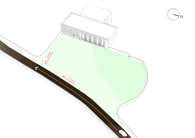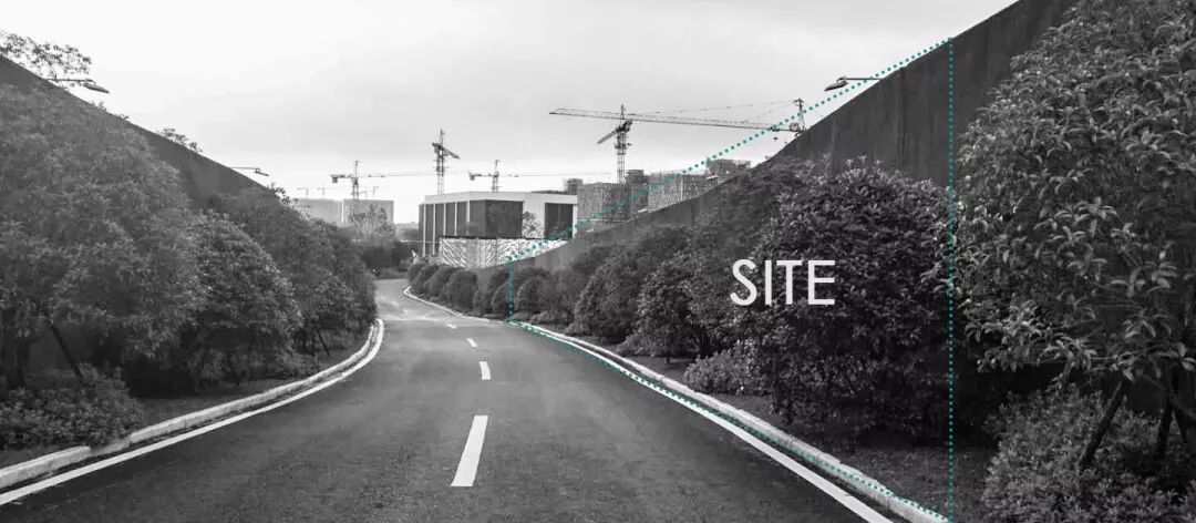 初夏,我们第一次来到了项目场地,在了解到场地多样的特殊性之后。面对我们眼前的是毗邻现状6米宽的临时道路,由北向南经过场地,南端为端头路。道路与售楼处建筑之间呈现三角斜坡,北高南低,西高东低,高差均在3米左右。在考虑到成本控制,我们在售楼处建筑与道路之间划定3000平米左右的设计范围。