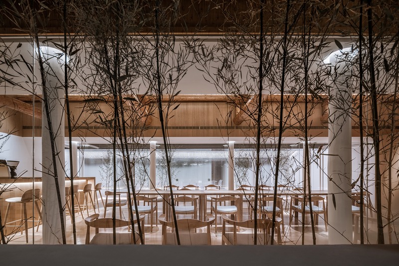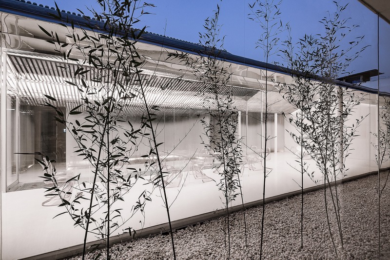 内部空间围绕一个线性的水景庭院展开,主要使用透明、半透明、反射性的材料和家具以弱化一个实体空间的物质存在感,营造有别于旧建筑的轻、透、飘的氛围,既映射又消隐于竹林庭院之中。北侧房屋是最为私密的客房区域。利用原建筑结构条件,一层空间被划分为四个房间。
