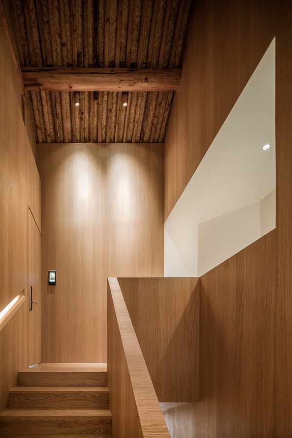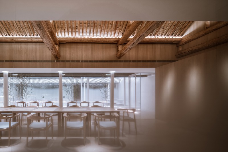 中间的房屋被处理成一个弹性使用的多功能空间,既可以与前面餐厅合并共同使用,也可以独立作为展厅,或者与后面客房区合并作为休息区。这个新建的建筑体在形式上尽量考虑与两侧坡顶旧建筑在尺度、采光、距离上的协调关系。