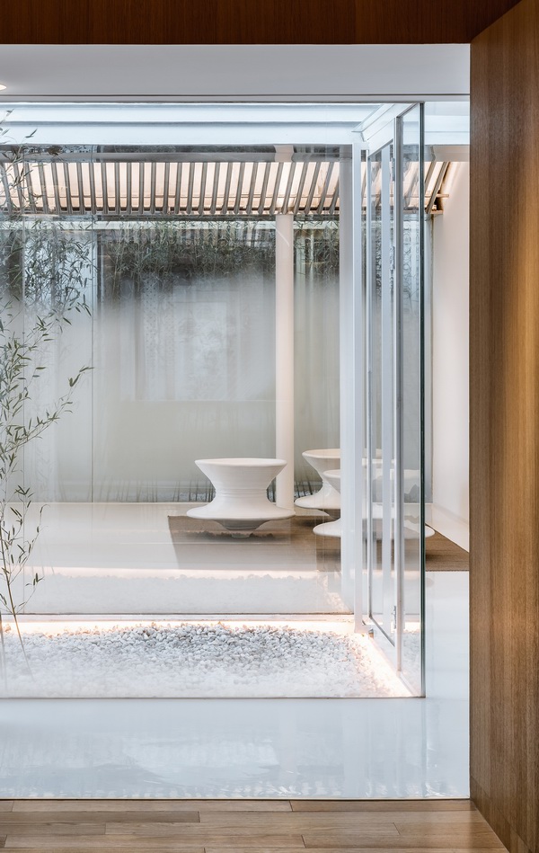 空间之间彼此分离又相互透叠,带有雾化图案的玻璃墙面犹如叠嶂一般,进一步强化了半透明感的空间效果,由此实现了由外至内不同空间场景和生活情境的叠合并置。