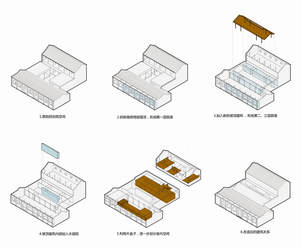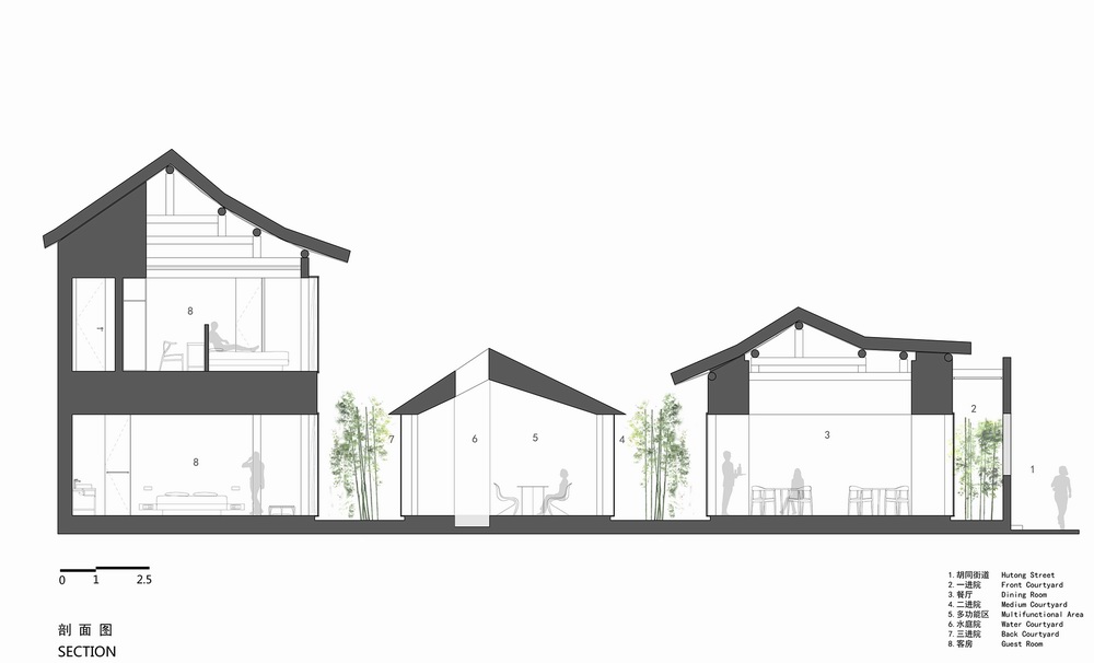 设计受到传统空间中“多重叠合院落”的启发,将原本的内合院改变为“三进院”,以此适应从公共到私密逐级过渡的功能使用模式,并利用院落的逐层过渡在喧闹的胡同街区之中营造出宁静、自然的诗意场景。“叠院儿”重新梳理了新与旧、内与外、人工与自然的关系。