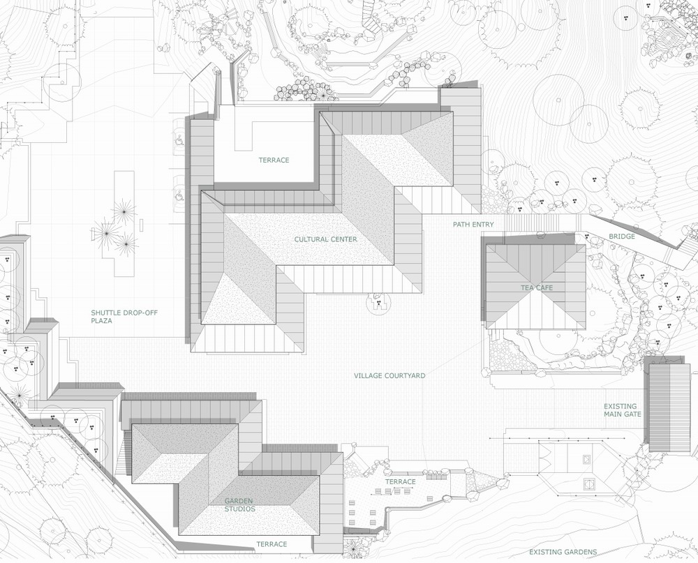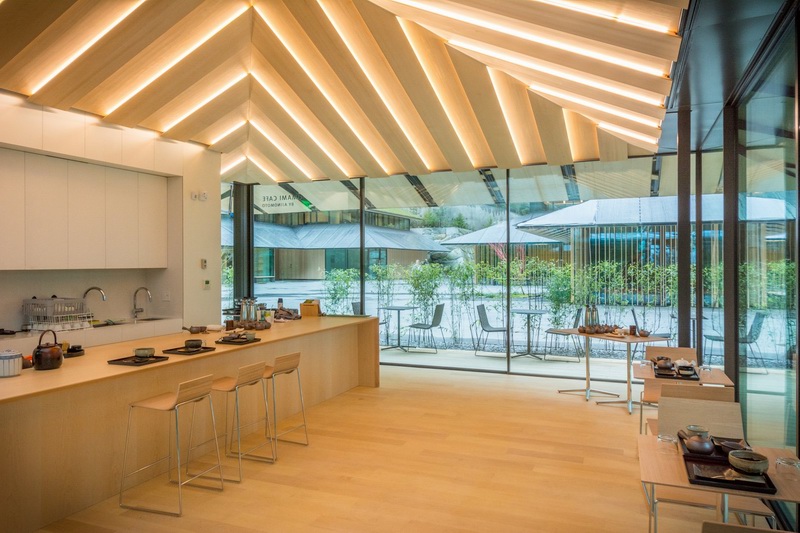 扩建部分于今年四月初对外开放,公园方希望在花园内打造一处文化村落。经过隈研吾与花园园长、及第三代花园工匠间的紧密配合,最终形成了这个以三组建筑围合中心庭院的形式。三组建筑分别提供了画廊、多功能厅以及一个展示日本文化的“文化角”及商店。