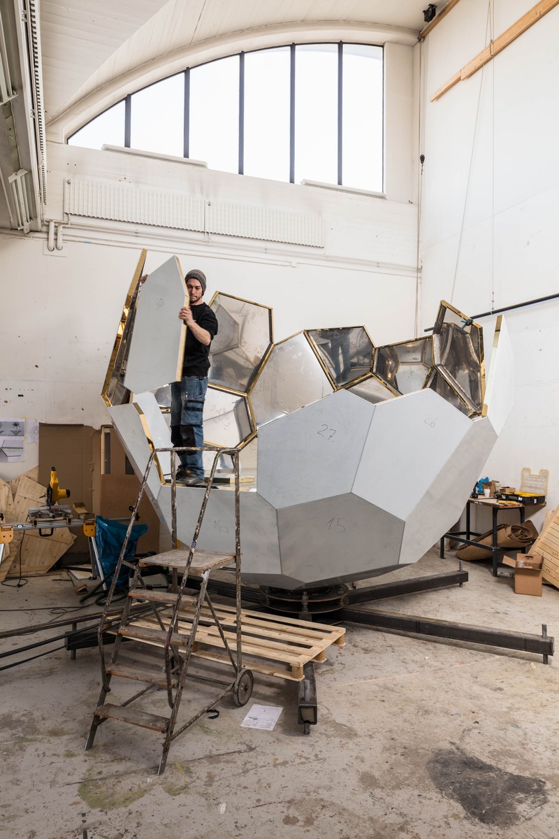 “金蛋”桑拿屋高五米,宽四米,由69块独立的镀金钢壳组成,可以方便地拆装组合,因此可以安放在城市任何角落。镀锌表面让它能够很好地反射四周的环境,达到与其相融的目的。
