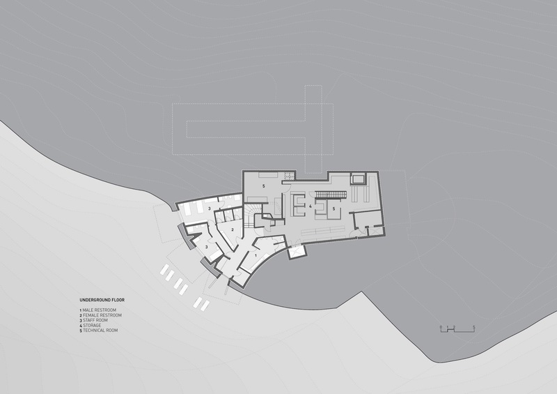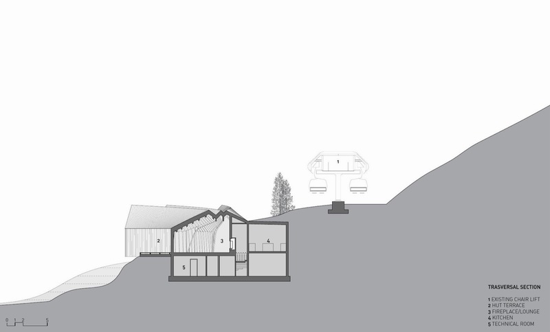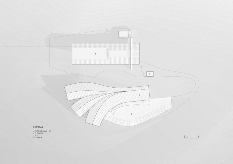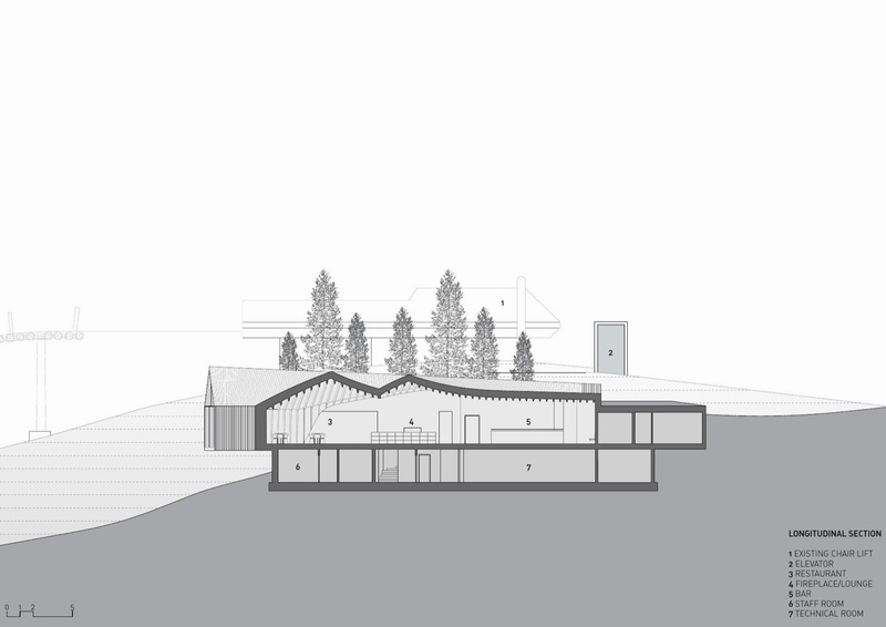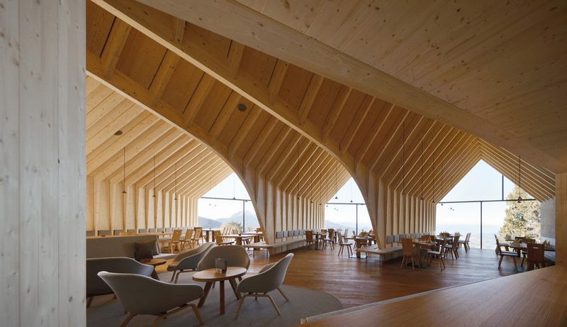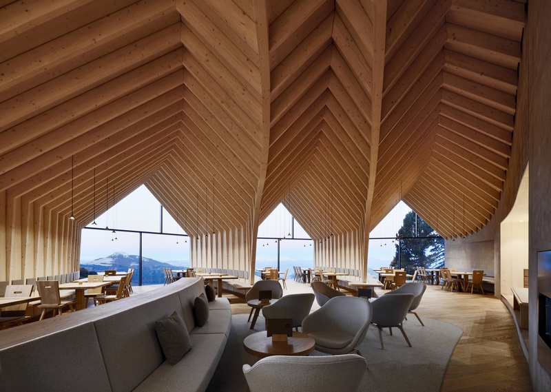 这座紧邻着一座缆车站的木屋有着优美的曲线“身躯”,内部容纳了一家餐厅。木屋的平面形态仿佛一根分叉的树干,三根树枝分别面对着远处三座山脉,分叉端头一整面的玻璃将山景收入室内。