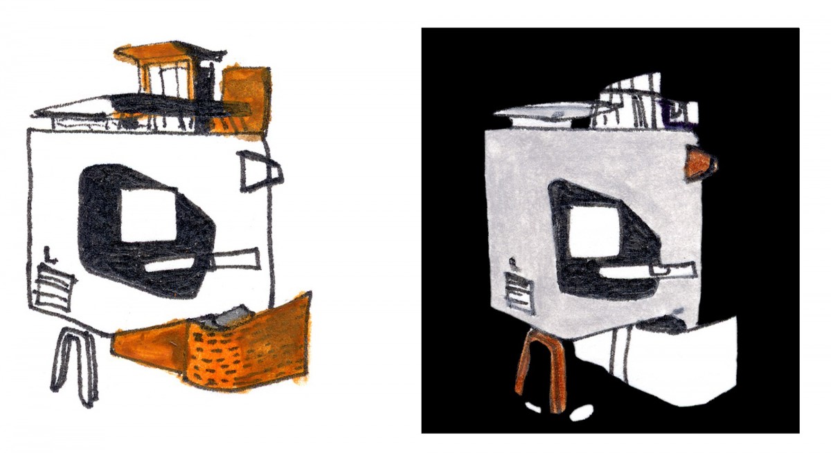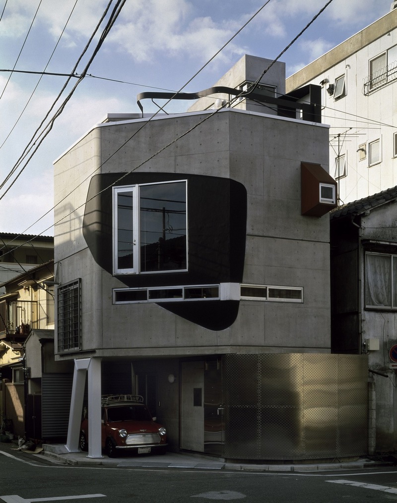 房子位于街道转角处,是一个首层被架空的混凝土盒子,架空部分由一对钢柱支撑,就像动物的两只细腿。盒子上开设了一个大窗、一条窄窗以及一个凸起的小窗。大窗周围有个黑色区域,就像牛头梗的半个脸。