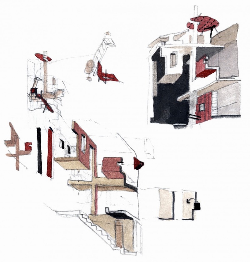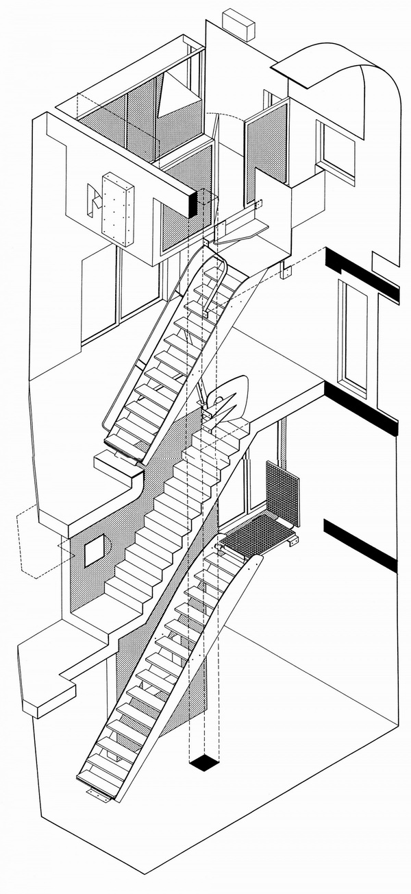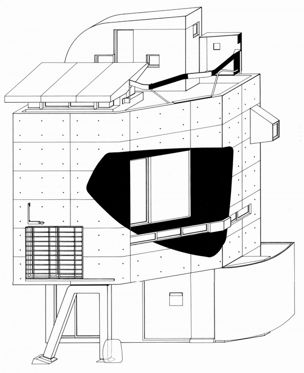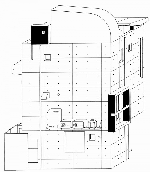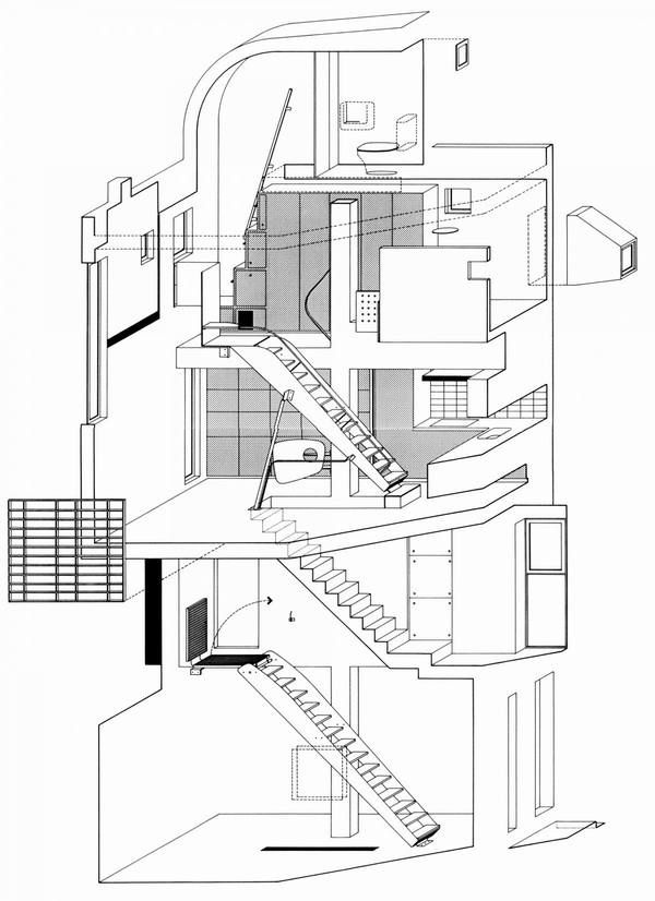由于房子用地狭窄,所以内部空间极为精致,从剖面图看简直就是一个切开的机器零件。据说为了运送家具方便,屋顶还设置了起重机。