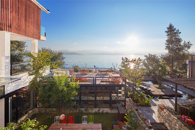多层次的公共空间设计:创造多层次的的公共空间体验,从多维度建立建筑与洱海的关系,让使用者可以各取所需,互不干扰。这个设计最难的是要跨过面前的马路欣赏前面的洱海水景。建筑与马路之间的关系很难处理。我们采用了用了一个半下沉的公共空间,来塑造一个双重的联系。空间下面通过隔墙低下来的地方,可以建立与水景的心理联系,空间上面新塑造了一个平台,建立起与洱海水景更为直接的关系。