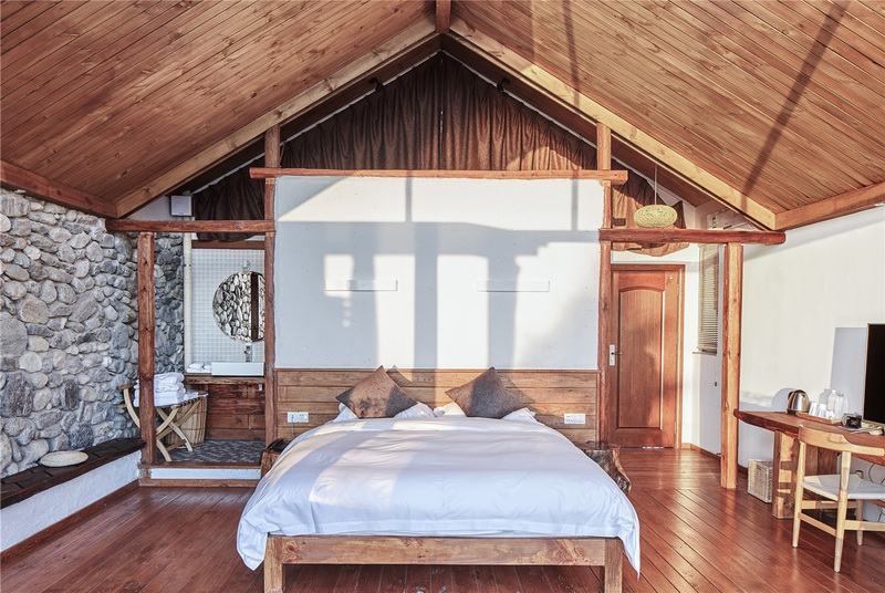 传统材料的当代表达:关注现代建造与传统之关系,在框架系统下用石头墙砌筑界面(当地工匠的一种成熟做法),用质朴材营造客房度假氛围。