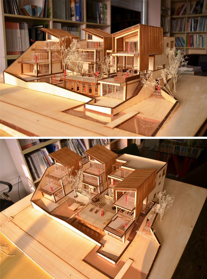 原设计为单坡屋顶(模型照片),希望是一个更现代性倾向的新乡土建筑,后来在施工过程中遇突发的风貌控制,只有改为双坡屋顶,略显遗憾。惊喜的是客房内部在双坡屋顶的框景下,与湖景共同构成更为精神性的空间,这点是我们在改方案时未曾想象的。