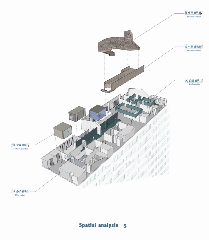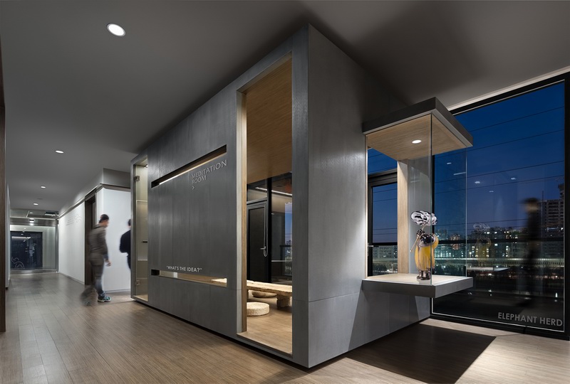 这种手法不仅使大象群办公空间在保持内在形象联系的同时变得像拼图游戏一样生动有趣,而且能解决许多实际的功能问题,如采光通风、动线组织、功能分区等。空间的关系无非就是加减法则。在这层里用到的加法就是在单一体块上附加几个相同或不同几何体共同组成,保持它们的主次关系的同时突出空间的形象与表现力。