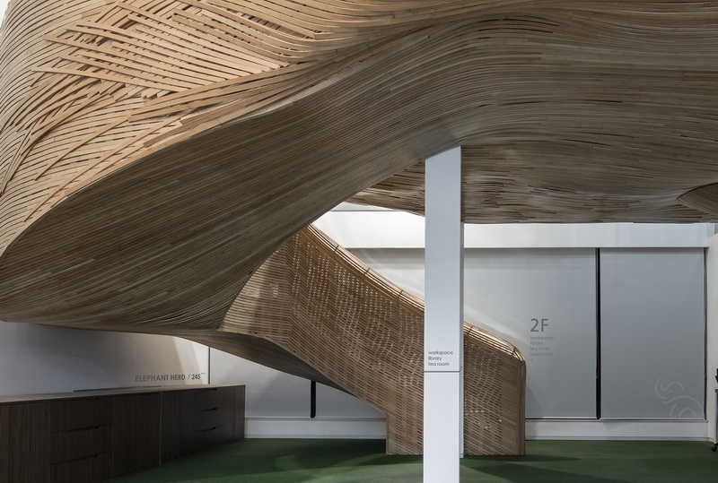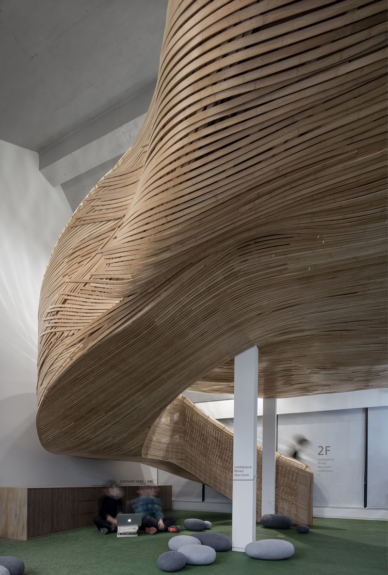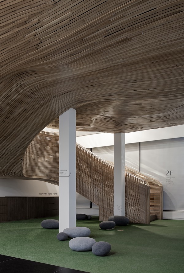 而竹子作为一种建筑材料代表了古代亚洲建筑体系的内涵,而中国它的产量是足够支撑装饰材料的消耗的,并且有着高韧性、可塑性强的特点。在连接顶层的楼梯部分,我们没有再让竹子继续沿用直线语素。