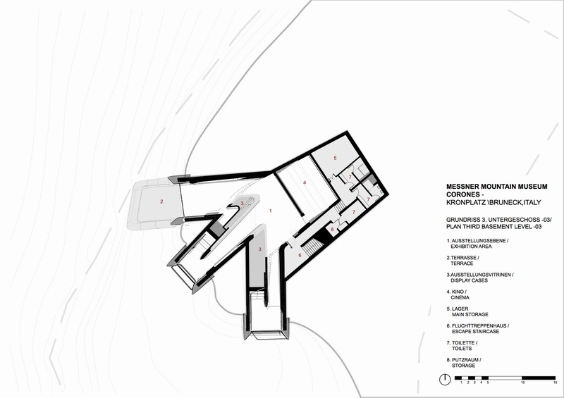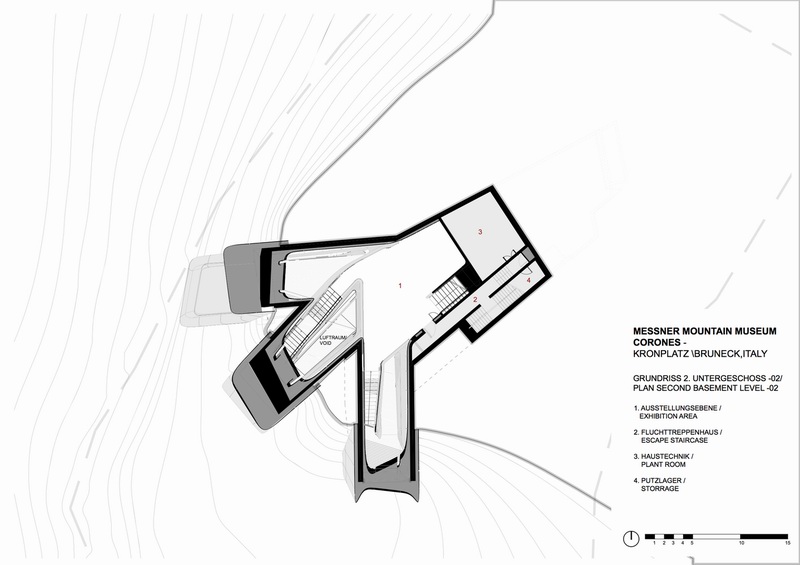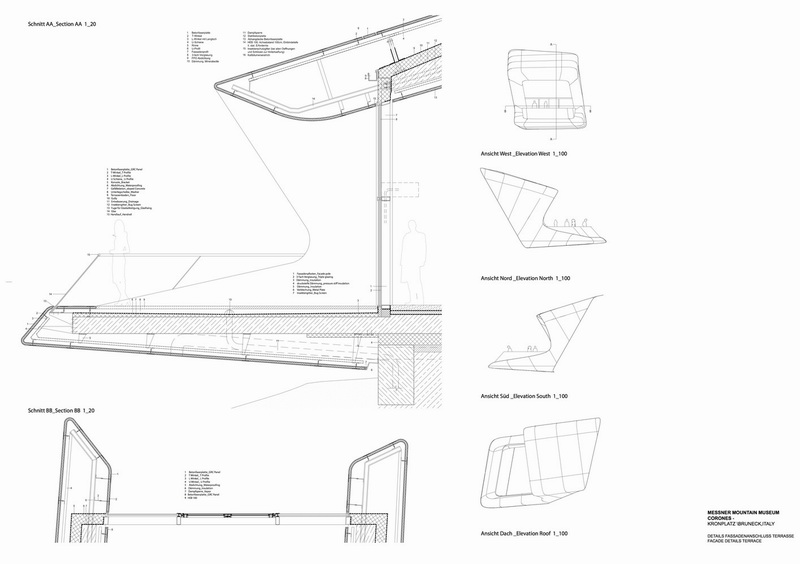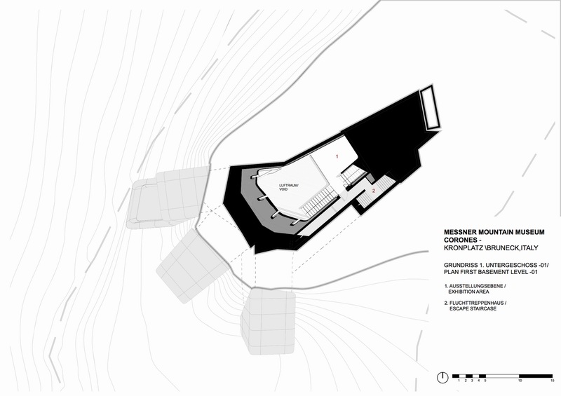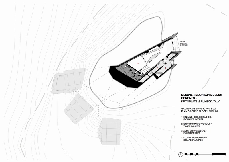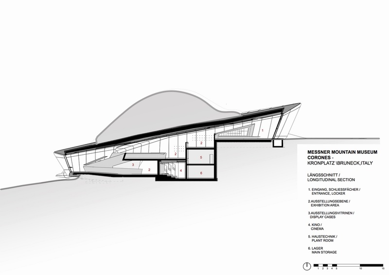 Zaha Hadid解释了设计理念——希望游客下到镶入山体中的博物馆,体验“洞穴”,然后到达山巅的另外一侧,在观光露台上享受山谷全景。因此,针对山谷中的美景,Zaha事务所的建筑师设置了三个不同方向的露台:第一个面朝西南望向Peitlerkofel山峰;第二朝南面对Heiligkreuzkofel山峰;第三个则朝西,可观赏Ortler和南蒂罗尔。