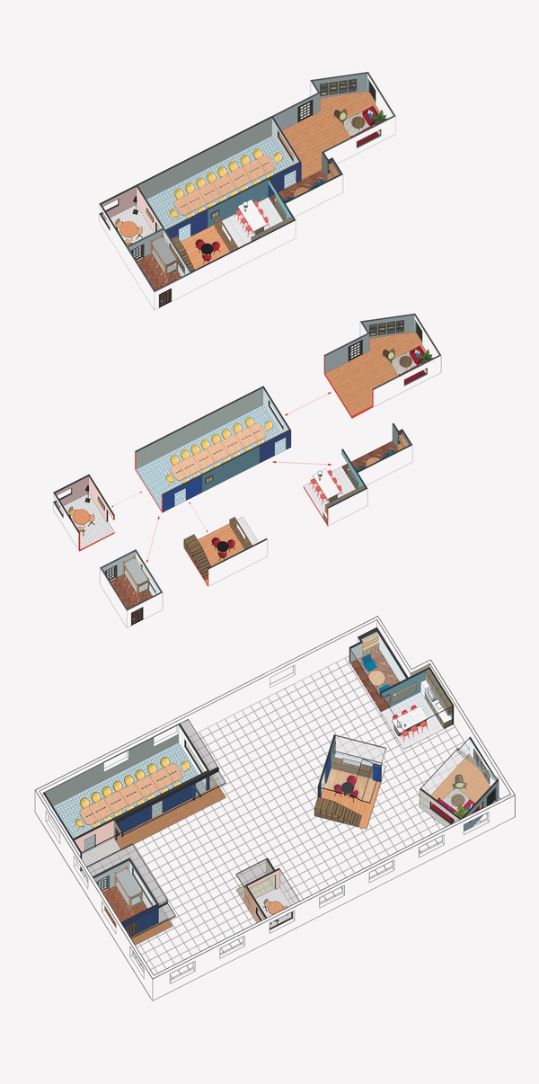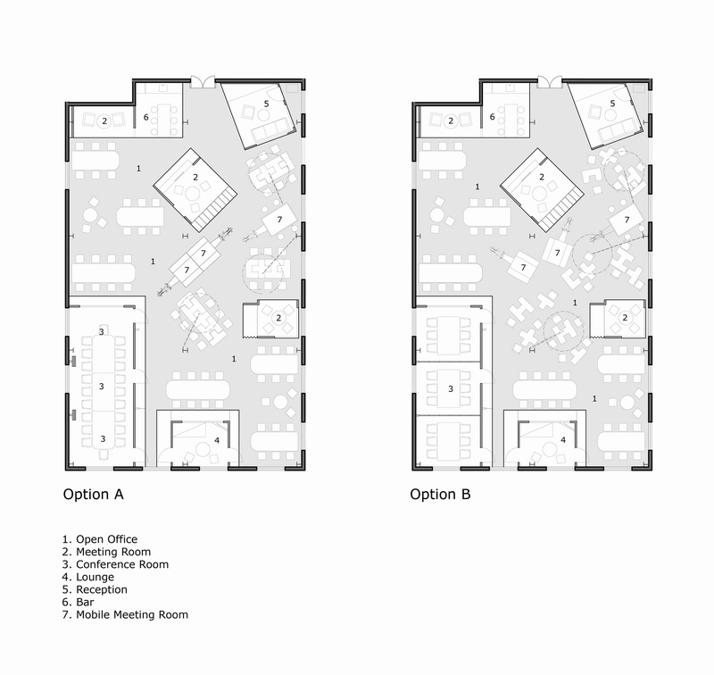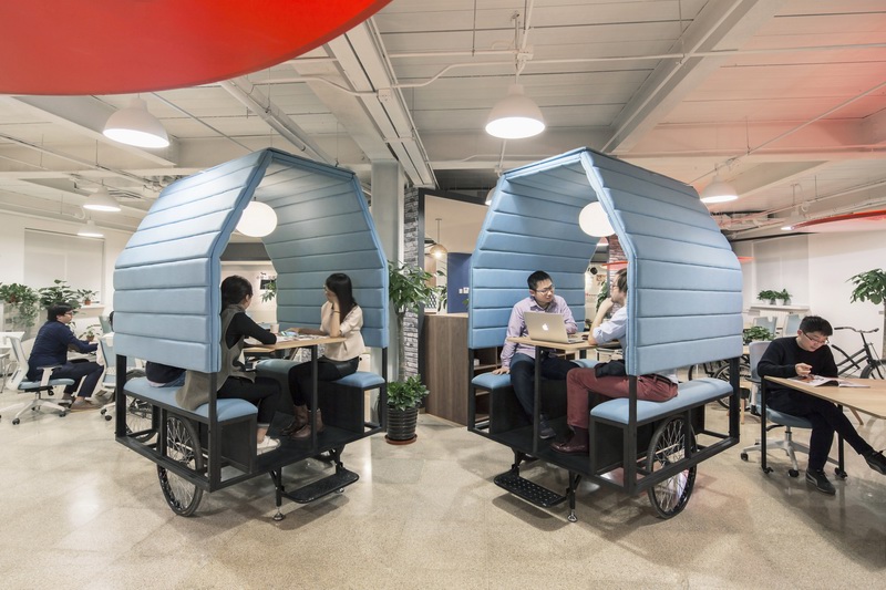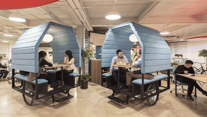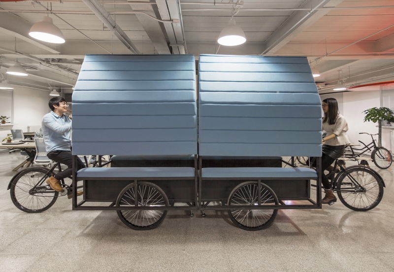 三轮车其实是可移动的会议室;凹凸办公桌可拆可合,灵活多变;红色太阳伞其实一面可移动的天花板,可以为下面的空间照明和电源。