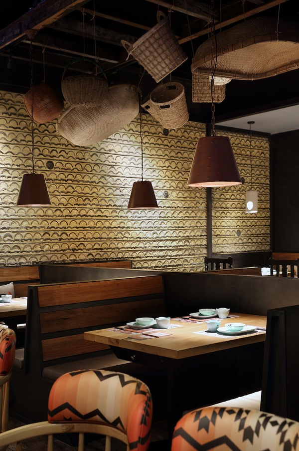 建筑文化中的砖、瓦同样在本案找到了现代化的新形式,设计师将古旧瓦片垒起,砌成一面整齐瓦片墙,有规则的波动弧度,让人浑似看到了海浪波纹。
