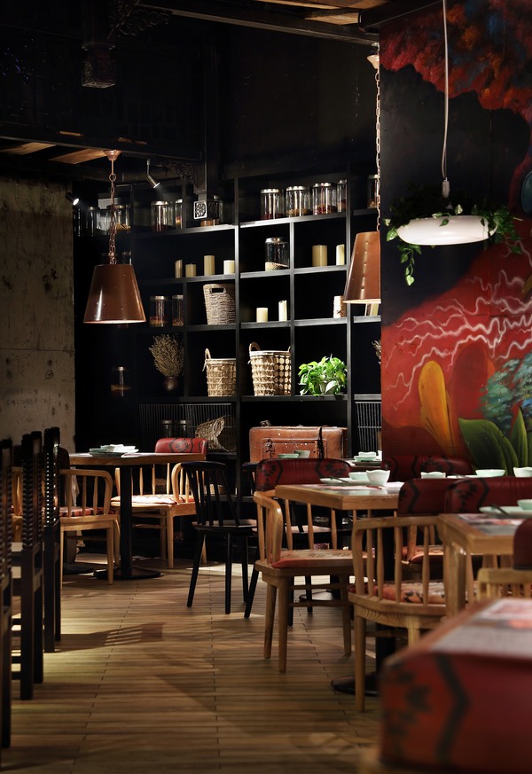 炭舍,是一个坚持传统风味与现代工艺相结合的干锅餐厅,本案以天府之国四川的地域风情、人文特色和建筑精髓为气质导向,设计师利用现代稳重手法,结合材料及工艺,将川式建筑中常见的穿斗式屋架造型简化为隔断框架运用于餐厅中,使得平面布局灵活,空间变化有序。另外,本案延续了炭舍以往的轻工业风,大量使用气质冷硬的黑色钢架,并用颜色活泼的水彩画来软化钢板的冷酷气息,营造出休闲怀旧的用餐空间。