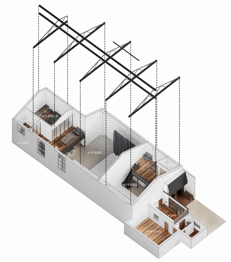 设计师根据功能需求,把原有的废弃的仓库空间,通过空间划分,分割出了咖啡厅,接待室,两个影棚,修图室,化妆间,器材室,库房等房间。