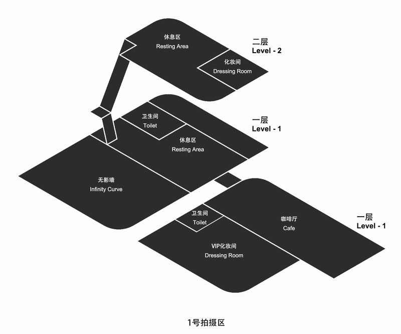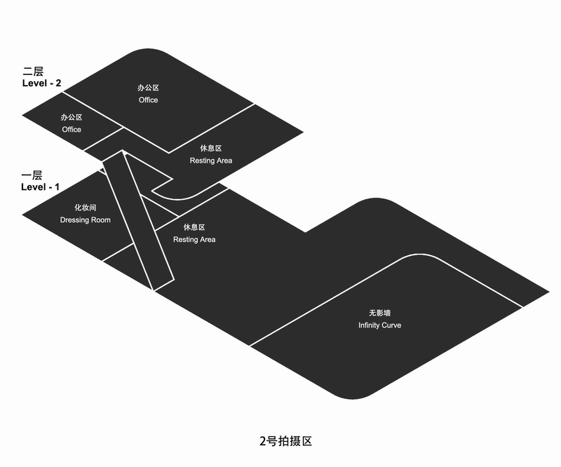 通长的厂房空间划分出两个相对独立的摄影空间,由于影棚摄影区摄影布景,灯光需求,需要通高的大空间来设置无影墙,同时需要满足一定的退无影墙距离来满足摄影的需求。