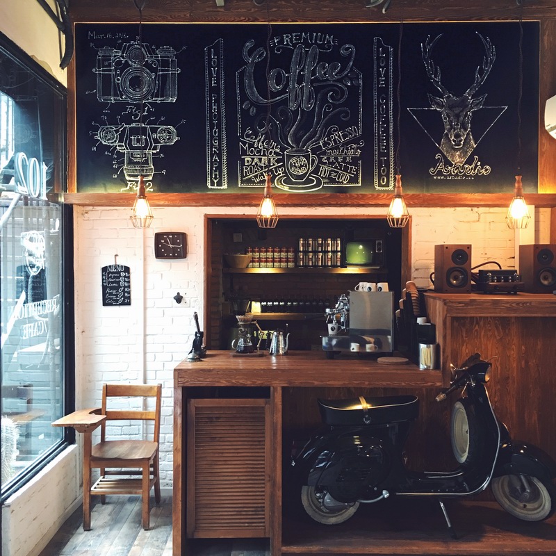 前区咖啡吧主要以复古基调为主。做旧的木板,各地低色温的灯光,以及木色的吧台,条桌,复古的配饰,共同烘托了前区厚重的复古质感。