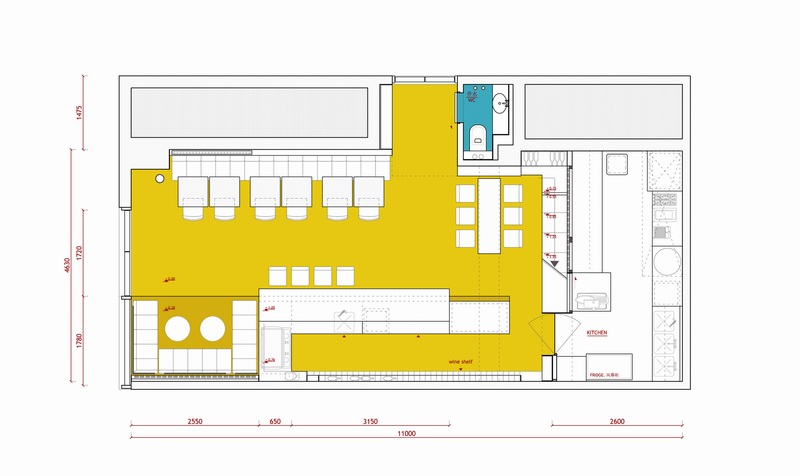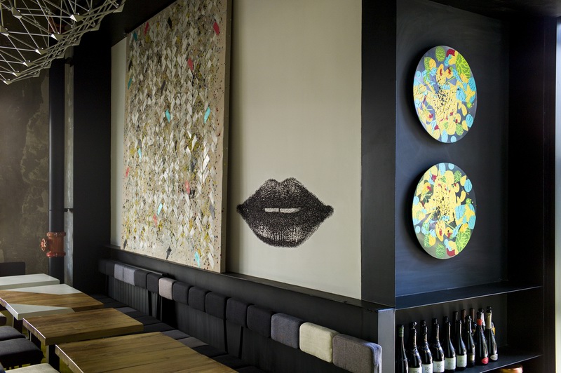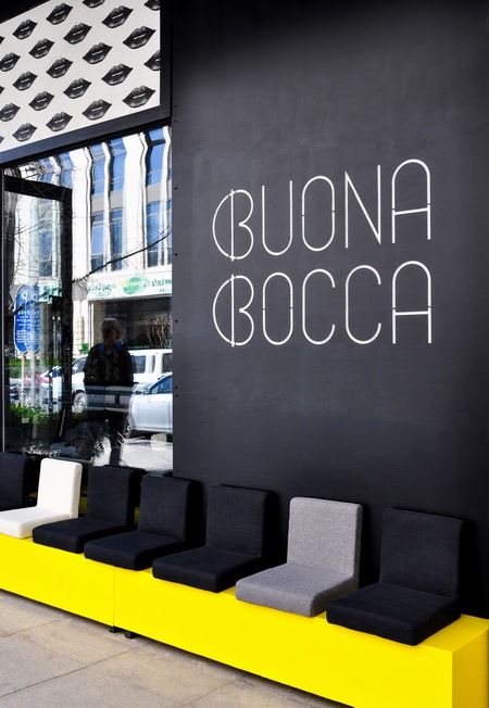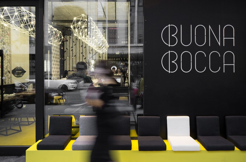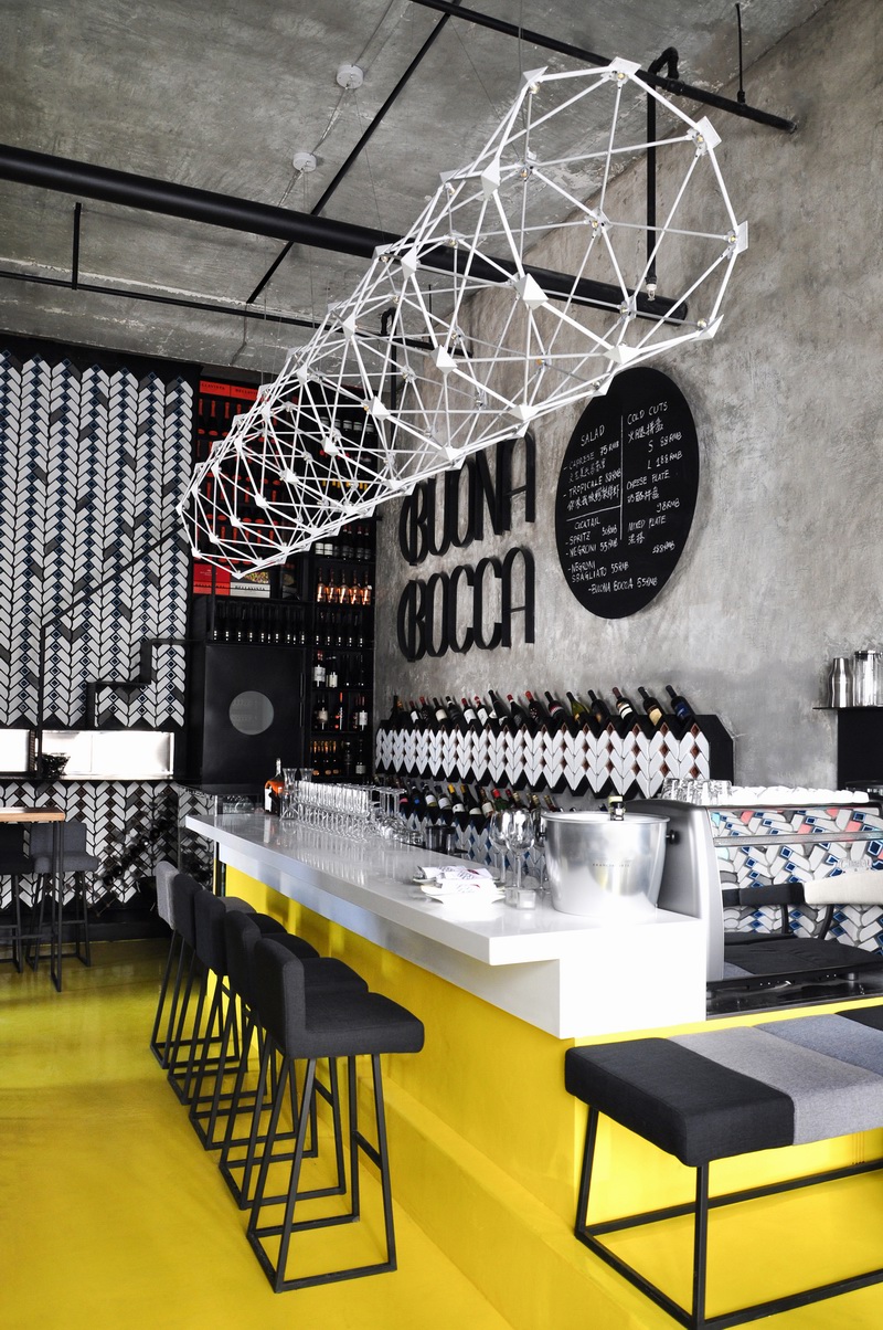 另外,业主还要求设计中体现出“BuonaBocca”这一词的含义,意大利语译为“好口”。设计师将其分解为好的味道以及情欲。于是我们看到墙面上到处出现的性感嘴唇的壁纸,黄色树脂地面,以及科技感十足的网架吊灯等时尚元素,共同营造出文化与潮流共存的浪漫空间。